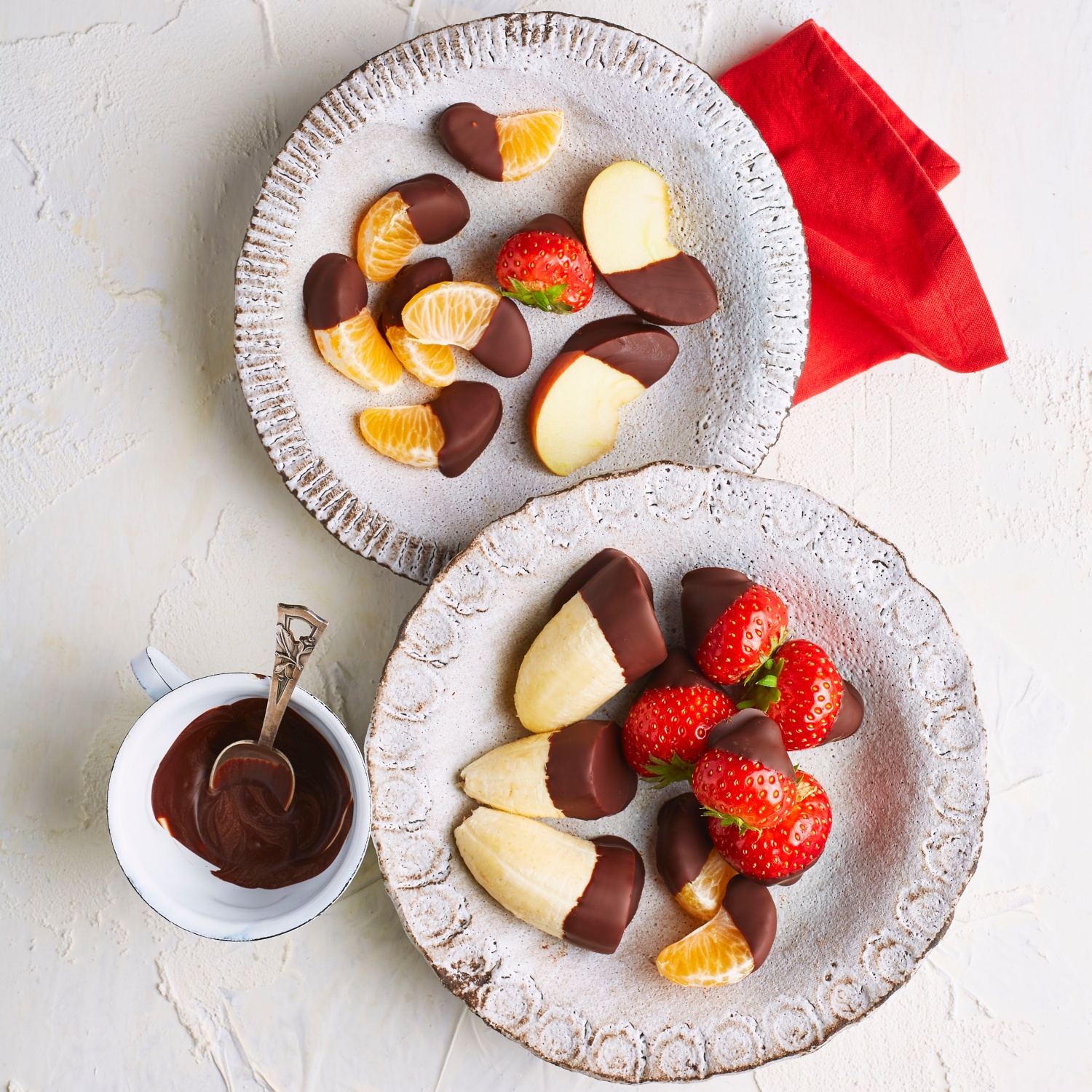 - Oder das Obst nacheinander in die Schokomasse tauchen, auf einem großen Teller abkühlen lassen und anschließend als Dessert oder essbare Deko servieren.