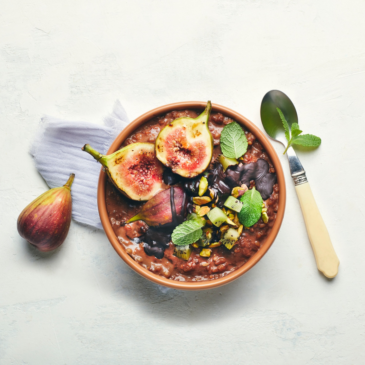 - Den Schoko-Milchreis mit den Feigen, den Kiwiwürfeln und der Schokoladensauce servieren. Mit etwas Minze und gehackten Pistazien dekorieren.