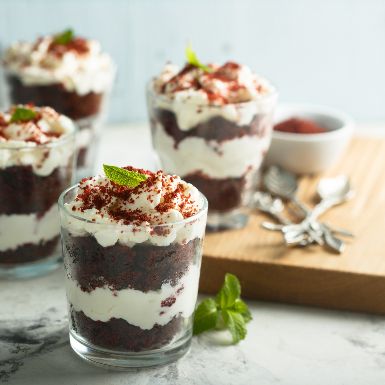- Mit Dessertgläsern glasgroße Kreise aus dem Schoko-Bisquitboden ausstechen und je einen Bisquit-Kreis in den Gläsern verteilen. Mit Kaffee beträufeln, dann eine Schicht Creme darauf geben. Eine zweite Schicht Schoko-Bisquitboden darauflegen, wieder mir Kaffee beträufeln und die restliche Creme darauf verteilen.