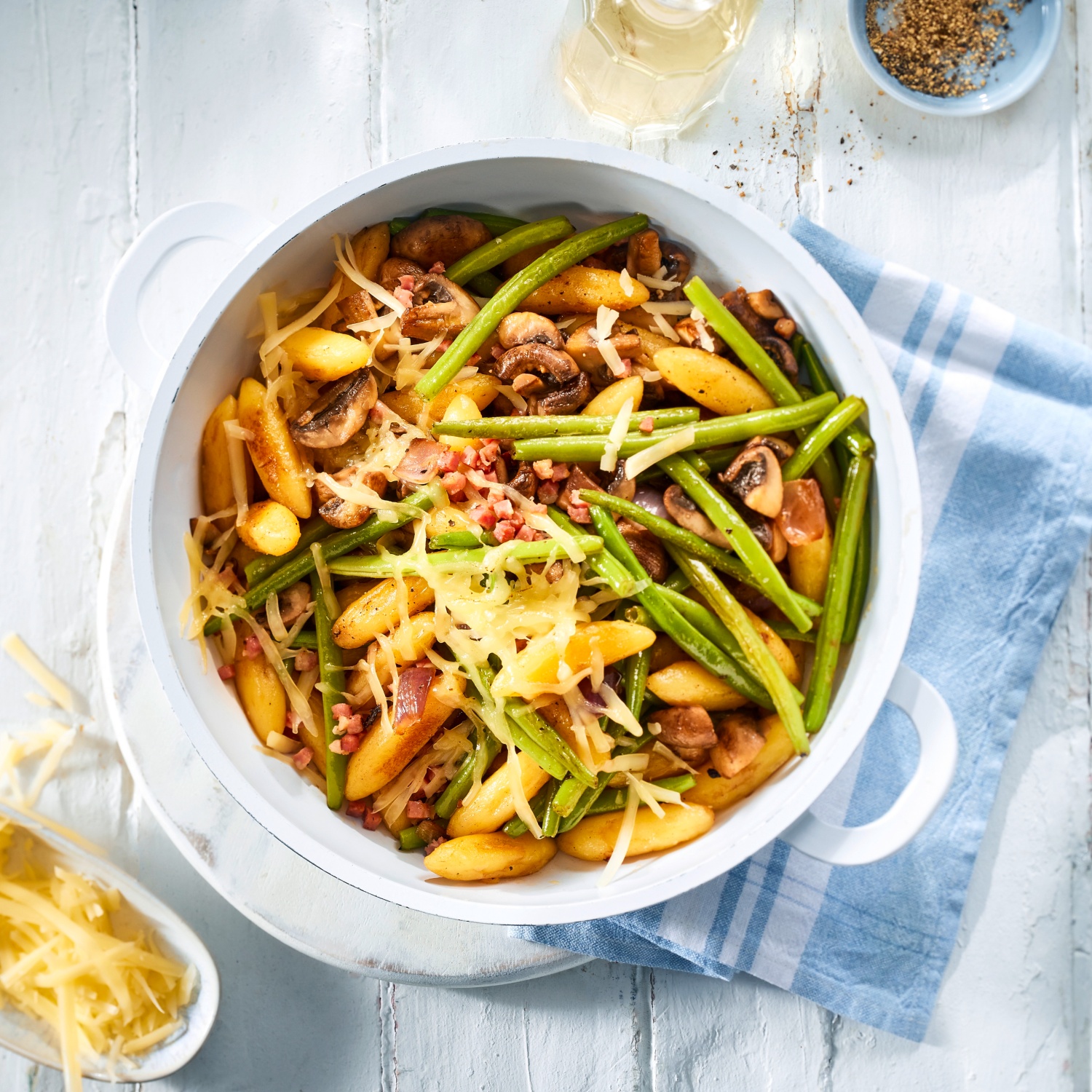 Schupfnudelpfanne mit grünen Bohnen und Speck