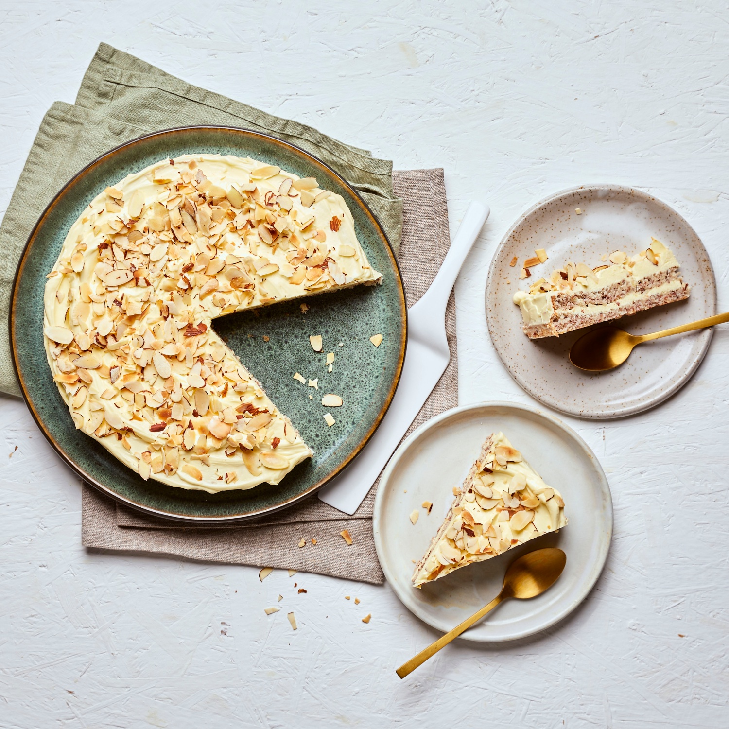 - Die Mandelblättchen in einer Pfanne goldbraun anrösten, kurz abkühlen lassen und auf dem Kuchen verteilen.