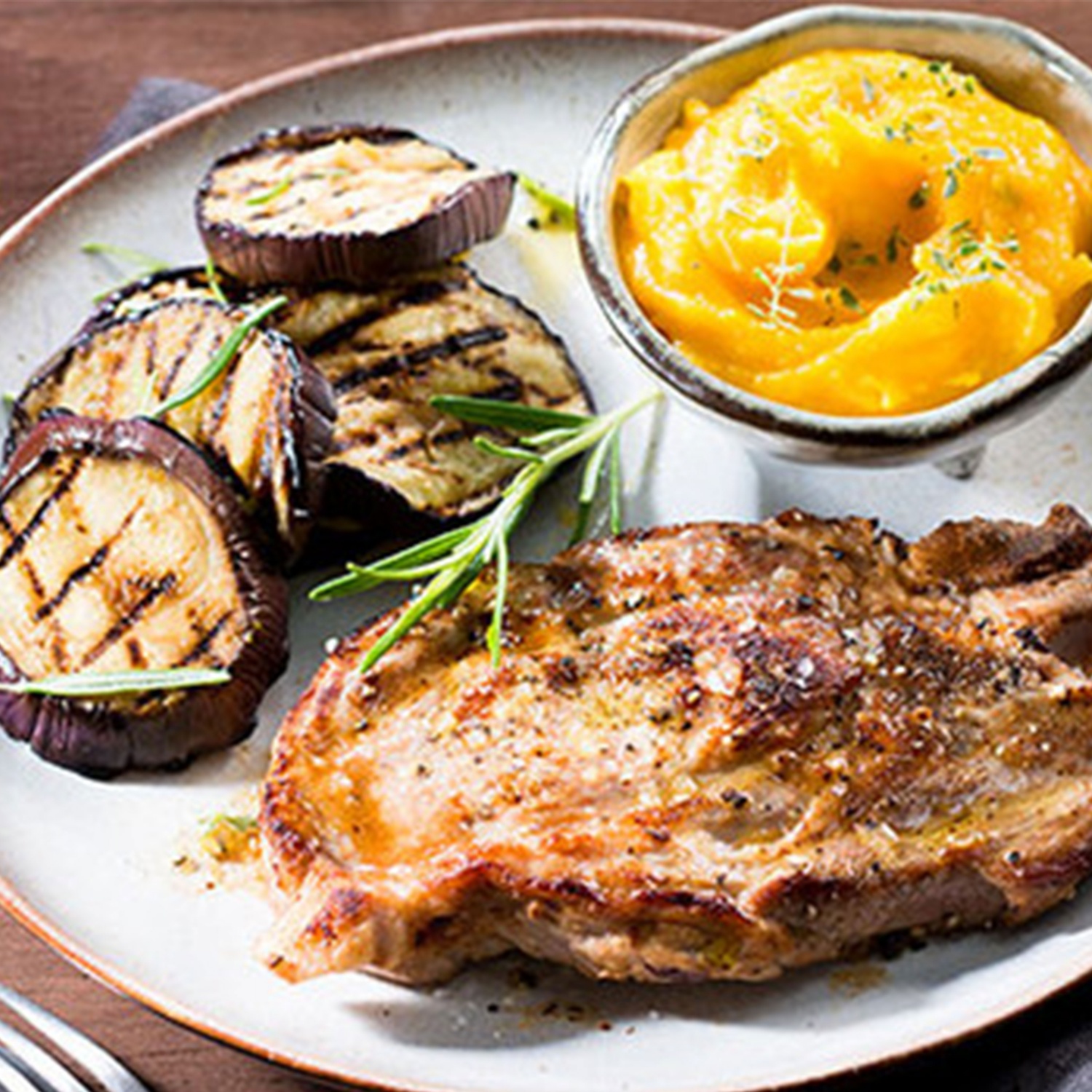 Schweine-Nackenkotelett mit gegrillter Aubergine und Kürbispüree