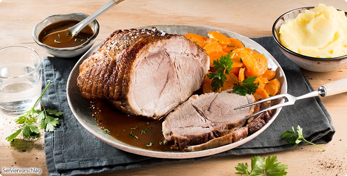 - Das Fleisch in Scheiben schneiden, auf einer vorgewärmten Platte anrichten und etwas warme Sauce darüber gießen. Die restliche Sauce, Kartoffelpüree und Möhren dazu servieren.