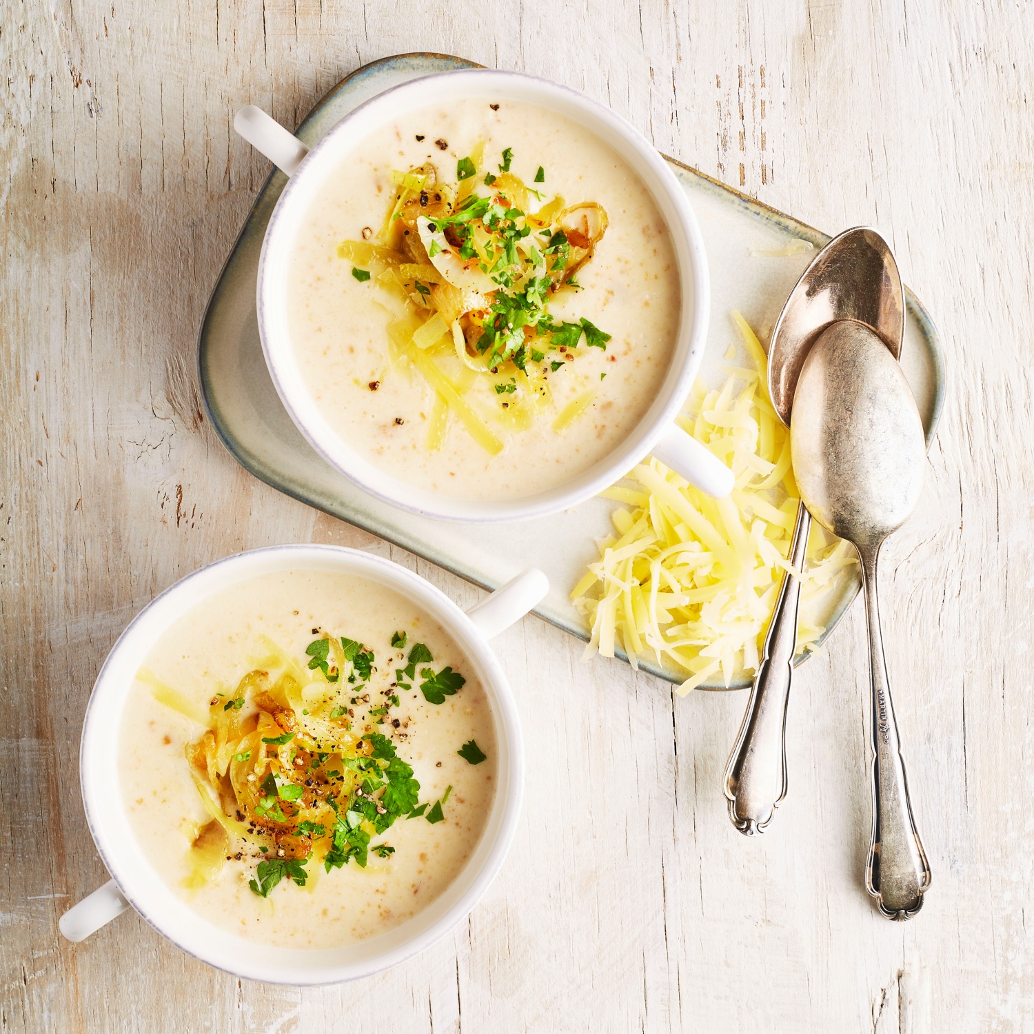 - Butter in einem Topf erhitzen und die Zwiebeln darin unter Rühren glasig dünsten. Knoblauch zum Schluss mitdünsten. Brot-Käse-Milchmischung zufügen, Brühe angießen und alles unter Rühren aufkochen lassen. Bei schwacher Hitze ca. 3 Minuten köcheln lassen. Die Suppe kräftig mit Salz, Pfeffer und Muskatnuss abschmecken.
