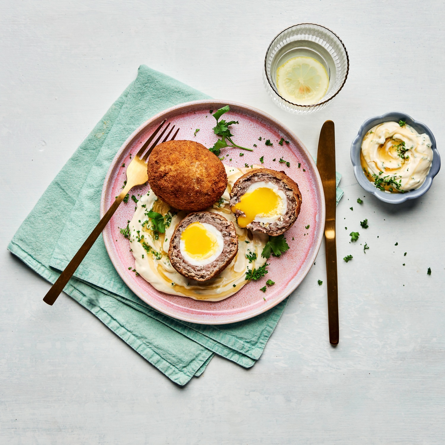 - Die Scotch Eggs mit der Senf-Mayo als Dip servieren.