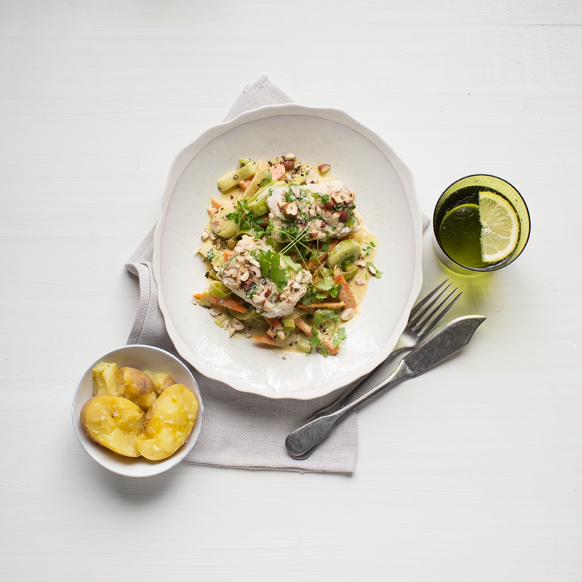 4. Den Seelachs waschen, trocken tupfen und auf das Lauchgemüse geben. Bei geschlossenem Deckel ca. 15 Minuten gar ziehen lassen. Den Seelachs mit dem Lauchgemüse und den gepellten Kartoffeln servieren.