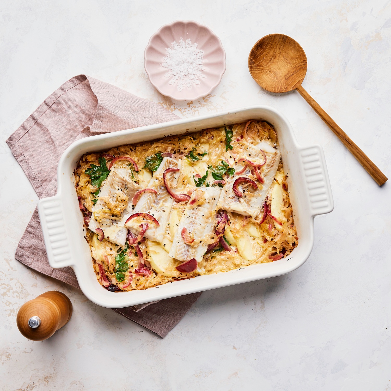 - In einer Auflaufform das Sauerkraut und die Apfelscheiben verteilen. Die Seelachsfilets halbieren und auf das Kraut setzen. Mit Salz und Pfeffer würzen. Den Crème-fraîche-Mix über alles gießen.