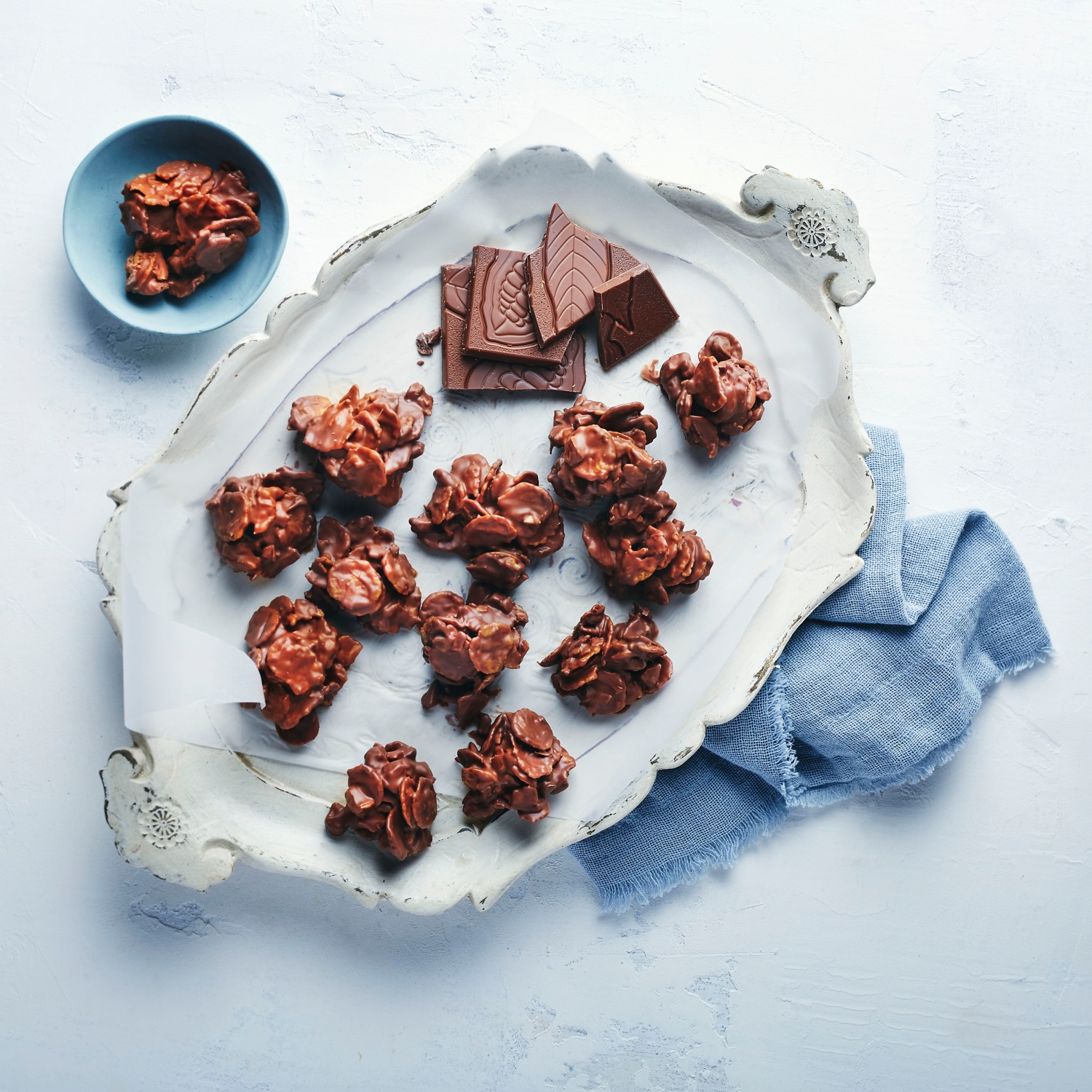 - Mit zwei Teelöffeln ca. 30 kleine Häufchen auf das Backblech portionieren. Die Schoko-Crossies ca. 3 Stunden fest werden lassen.