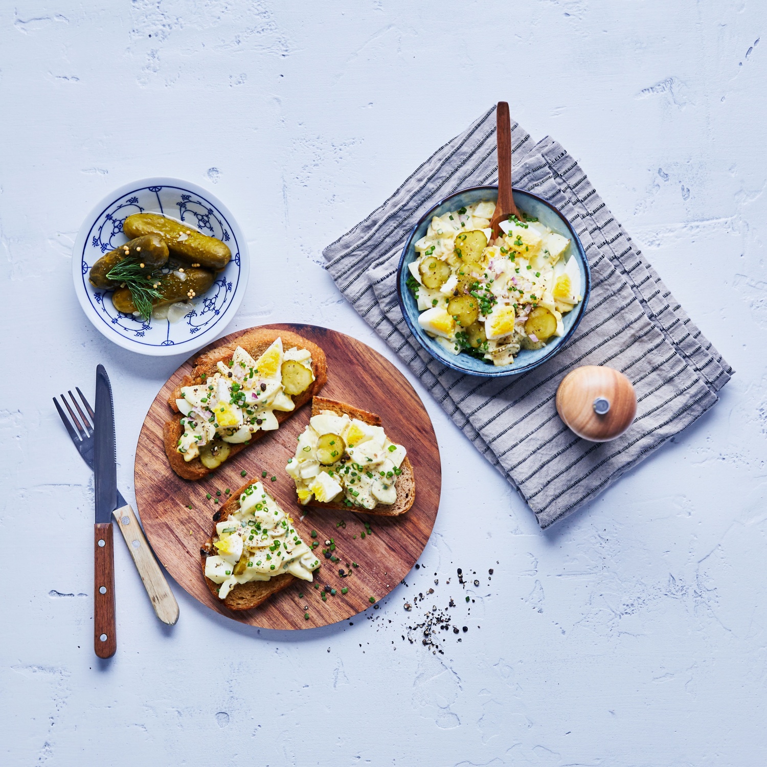 - Den Schnittlauch waschen, in Röllchen schneiden und vor dem Servieren unter den Eiersalat heben. Mit den gerösteten Brotscheiben servieren.