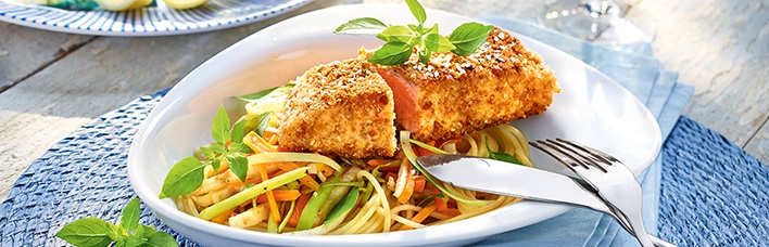 Lachs ist ein sehr einfach zuzubereitender Fisch, da das Marinieren nicht lange dauert. Die Sesamkruste und die Ergänzung mit Gemüsenudeln verleihen ihm zudem einen raffinierten Touch. Zum Rezept