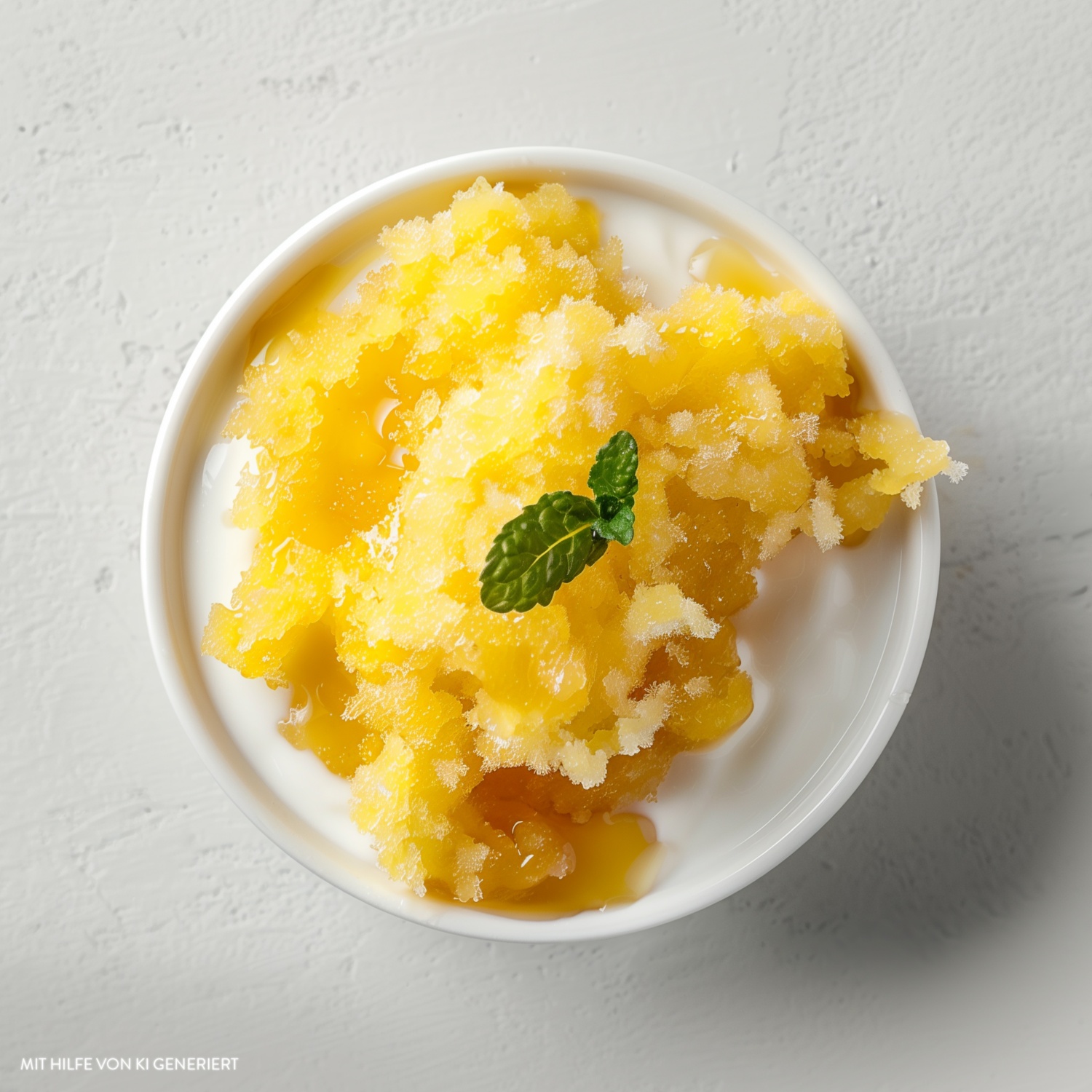 - Den Joghurt in kleine Schalen füllen und das Orangen Shaved Ice darüber geben. Mit dem Zitronensirup beträufeln und mit frischer Minze garnieren.