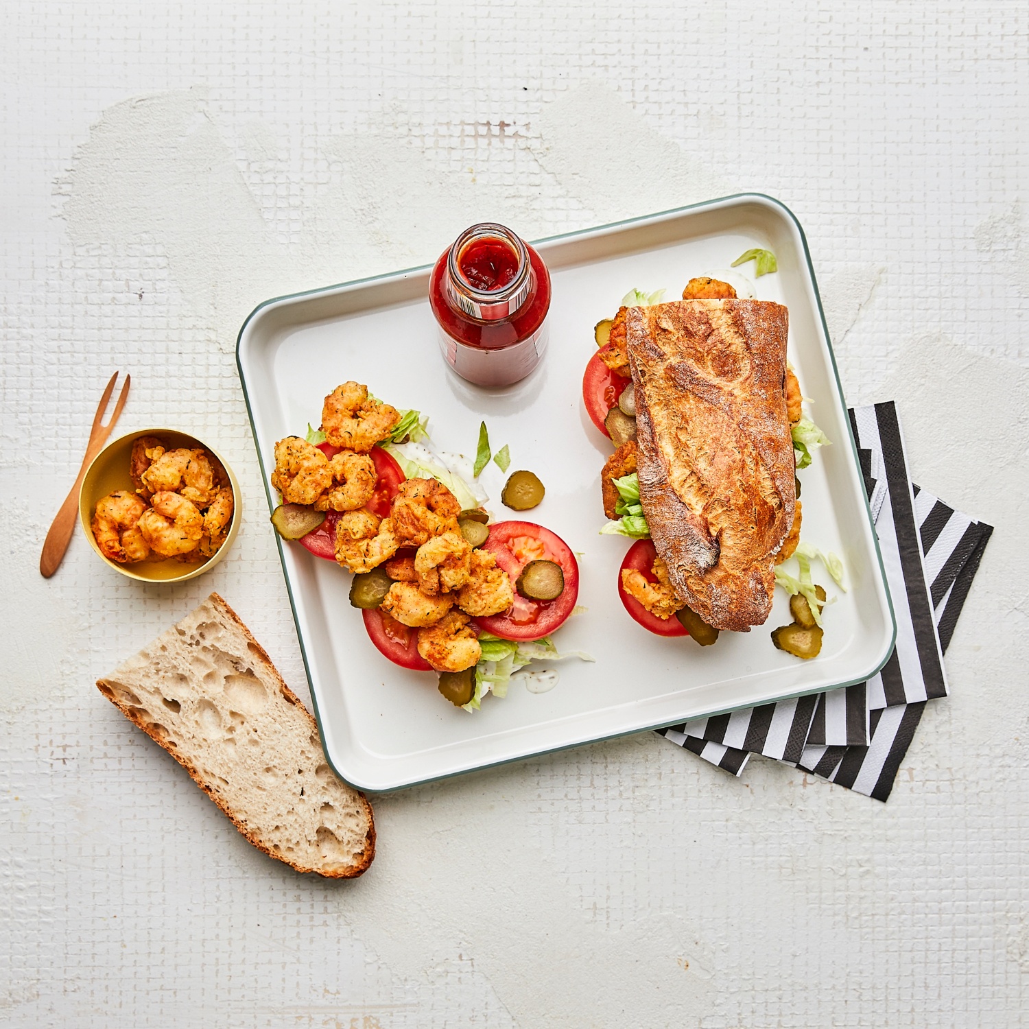 - Die Baguette-Innenseiten mit der Remoulade bestreichen, mit Salat, Tomaten, Gurken und den frittierten Garnelen belegen.