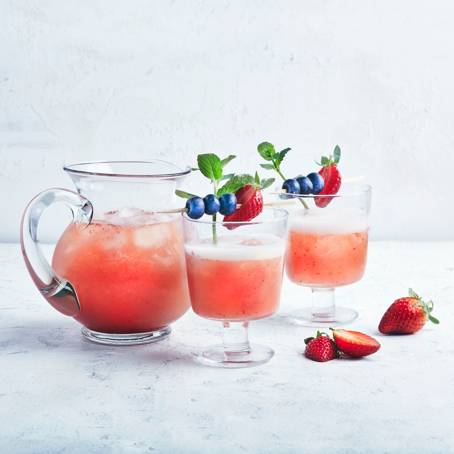 - Die Gläser mit der Sommerbowle füllen und in jedes Glas 1 Fruchtspieß und 1 Minzzweig stecken.