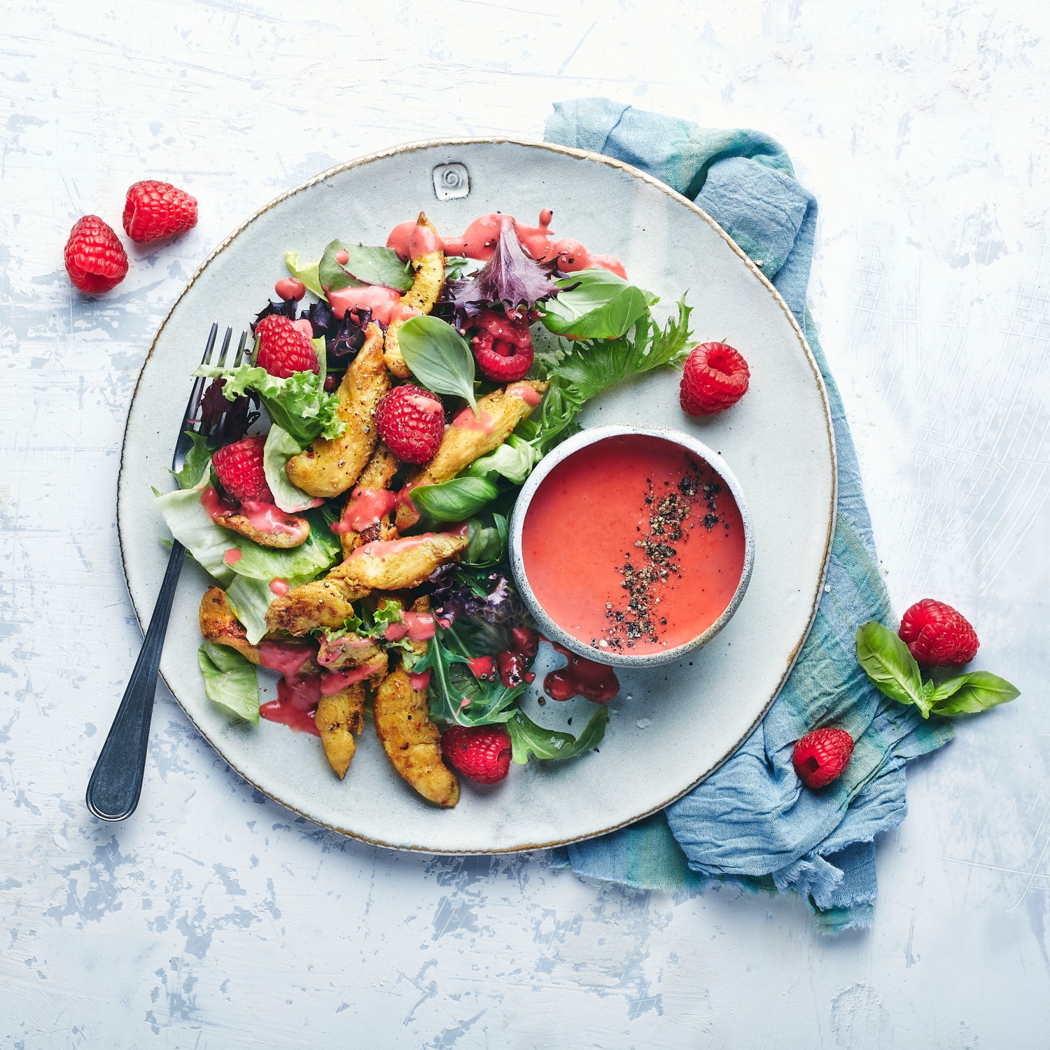 Sommerlicher Salat mit Hähnchenstreifen & Himbeervinaigrette