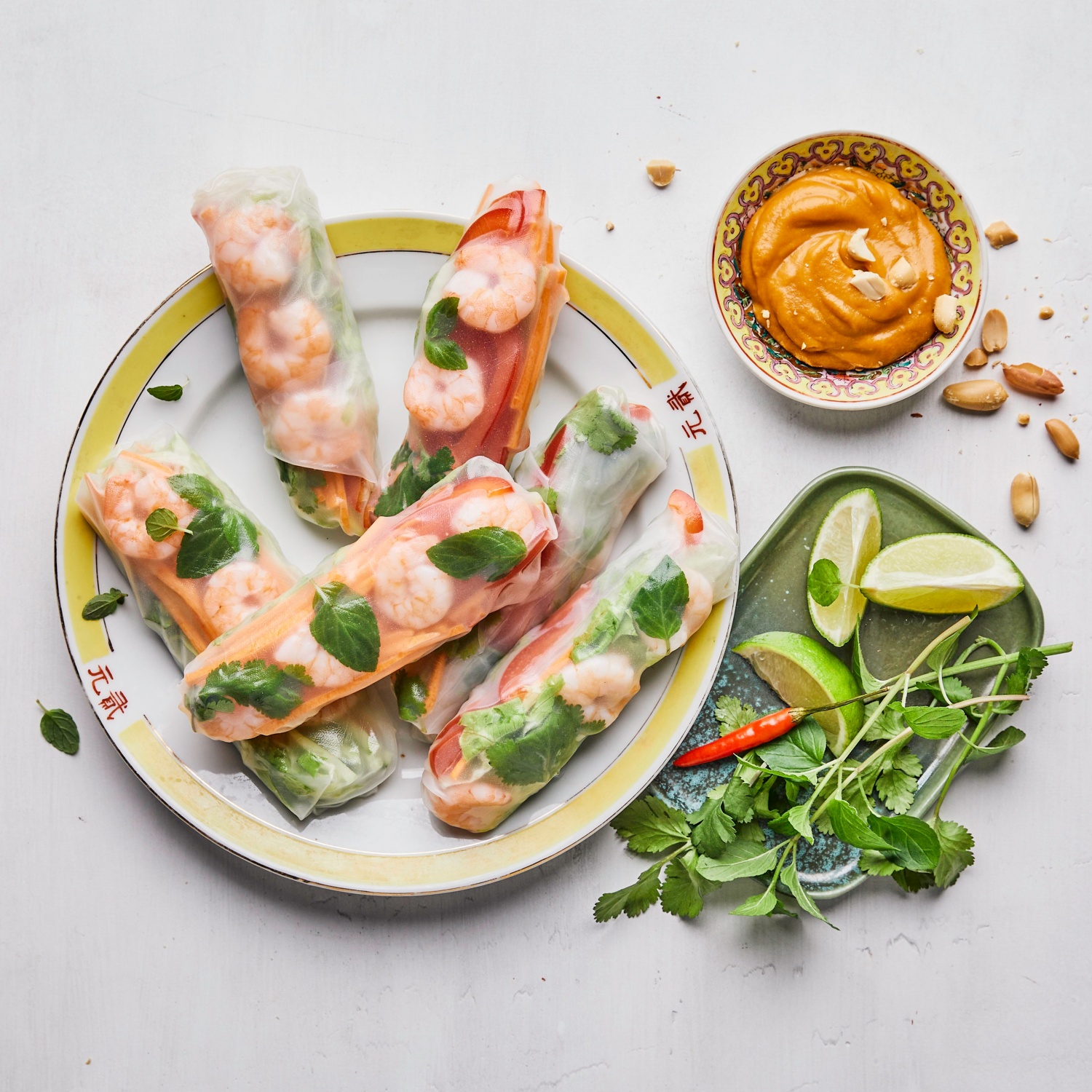 4. Das Reispapier kurz in Wasser tauchen, mit der rauen Seite nach oben legen und mit 1–2 Salatblättern, etwas Gurke, Möhre, Paprika und den Glasnudeln belegen. 2 Garnelen hineinlegen und mit Koriander und Minze toppen. Mit Limettensaft beträufeln.