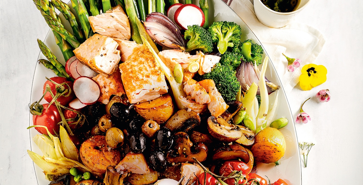- Die gekochten Eier pellen und halbieren. Den lauwarmen Lachs mit einer Gabel vorsichtig in Stücke teilen und zusammen mit dem Gemüse auf einer großen Servierplatte anrichten.