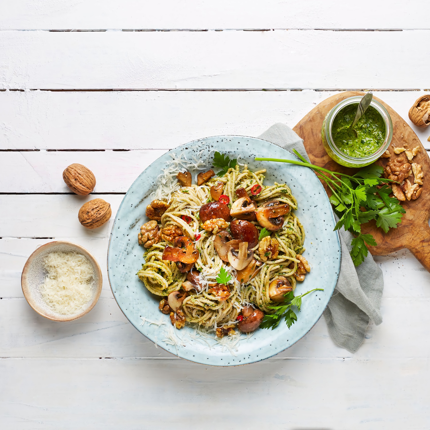 Spaghetti mit Champignons, Walnusspesto und frisch gehobeltem Grana Padano