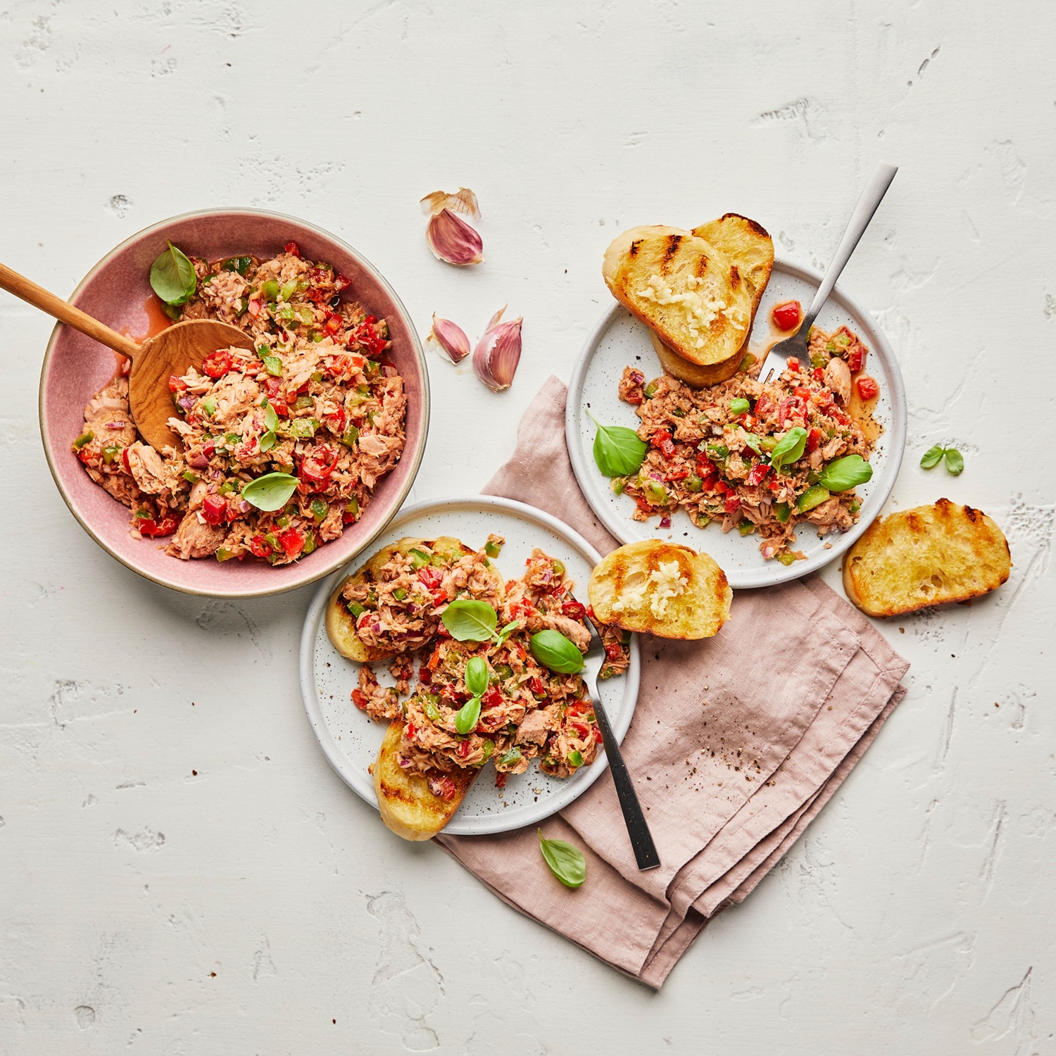 - Den Thunfischsalat mit Basilikumblättern garnieren und mit den gerösteten Brotscheiben servieren.