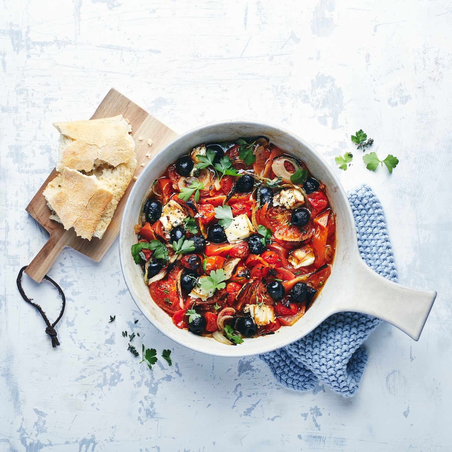 4. Das spanische Ofengemüse mit frischen Kräutern anrichten und mit ofenfrischem Baguette servieren.