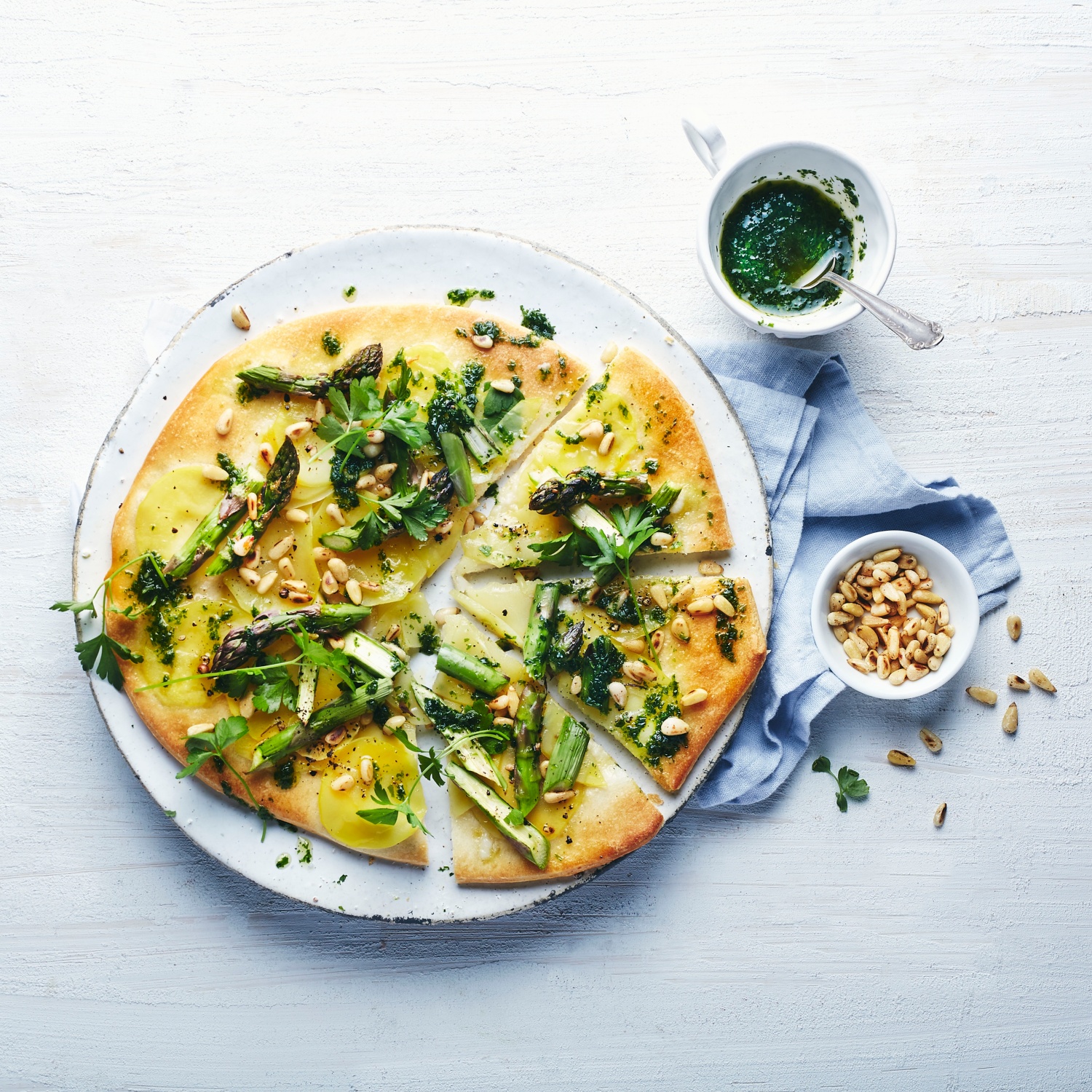 Spargel-Kartoffel-Pizza mit grüner Petersiliensauce