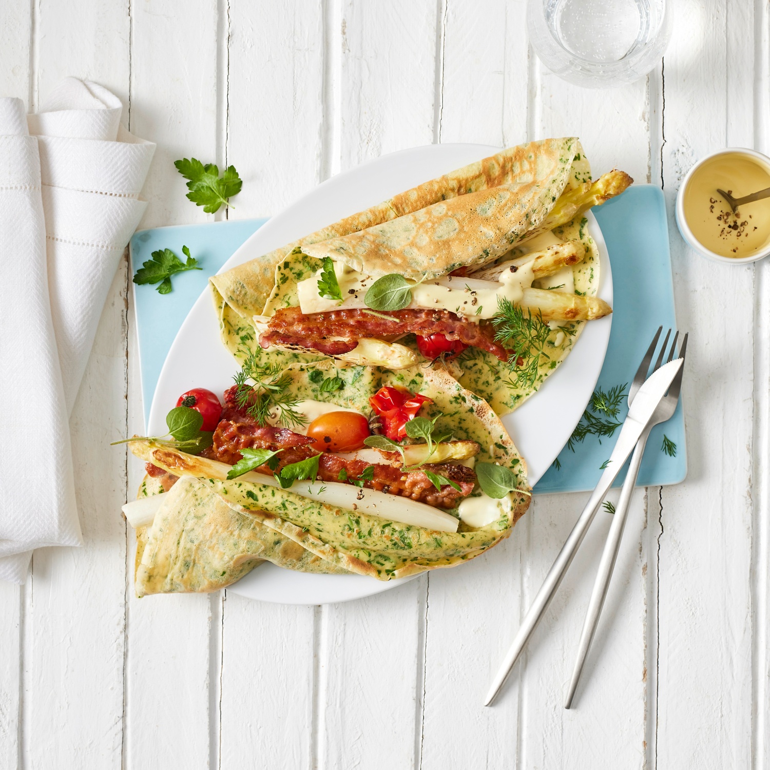 Spargel mit Sauce Hollandaise und Speck in Kräutercrêpes
