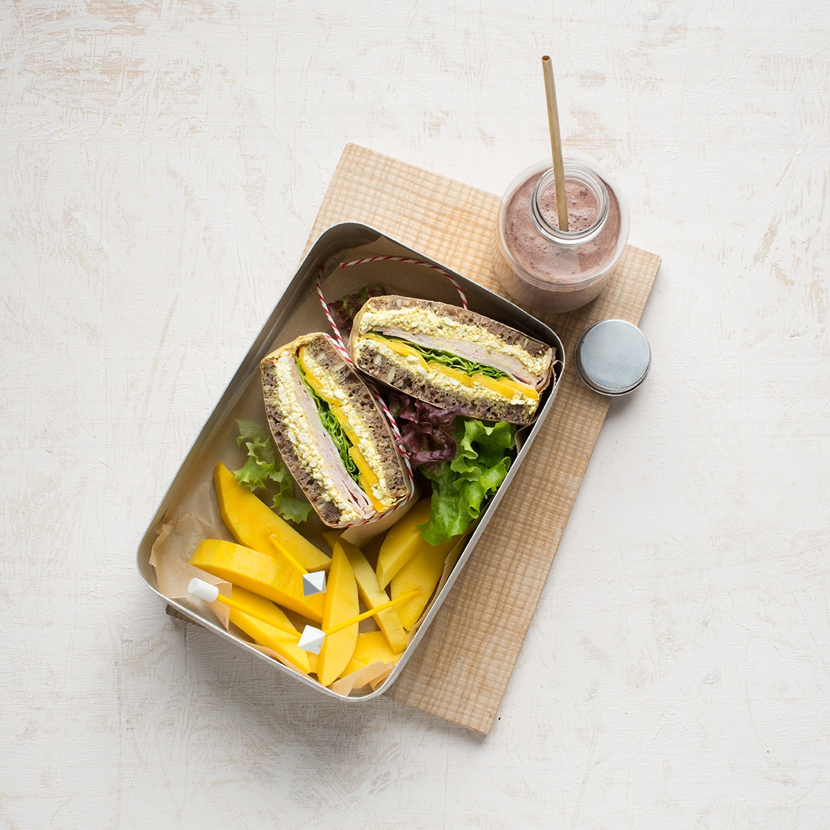 - Die Stulle mit der Mangohälfte in eine Lunchbox packen und mitnehmen.