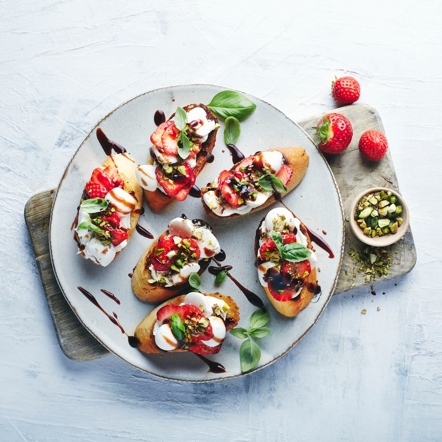 Süße Bruschetta mit Erdbeeren, Mozzarella und Balsamico