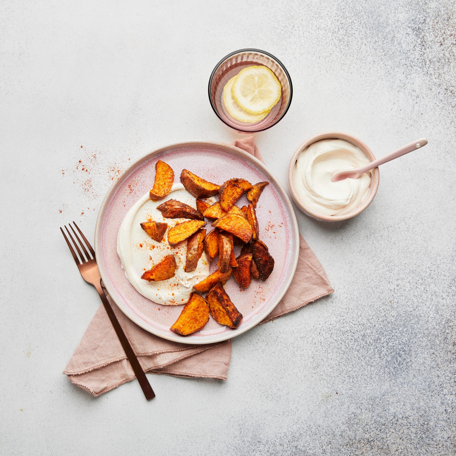 - Süßkartoffel-Wedges mit Sour Cream servieren.