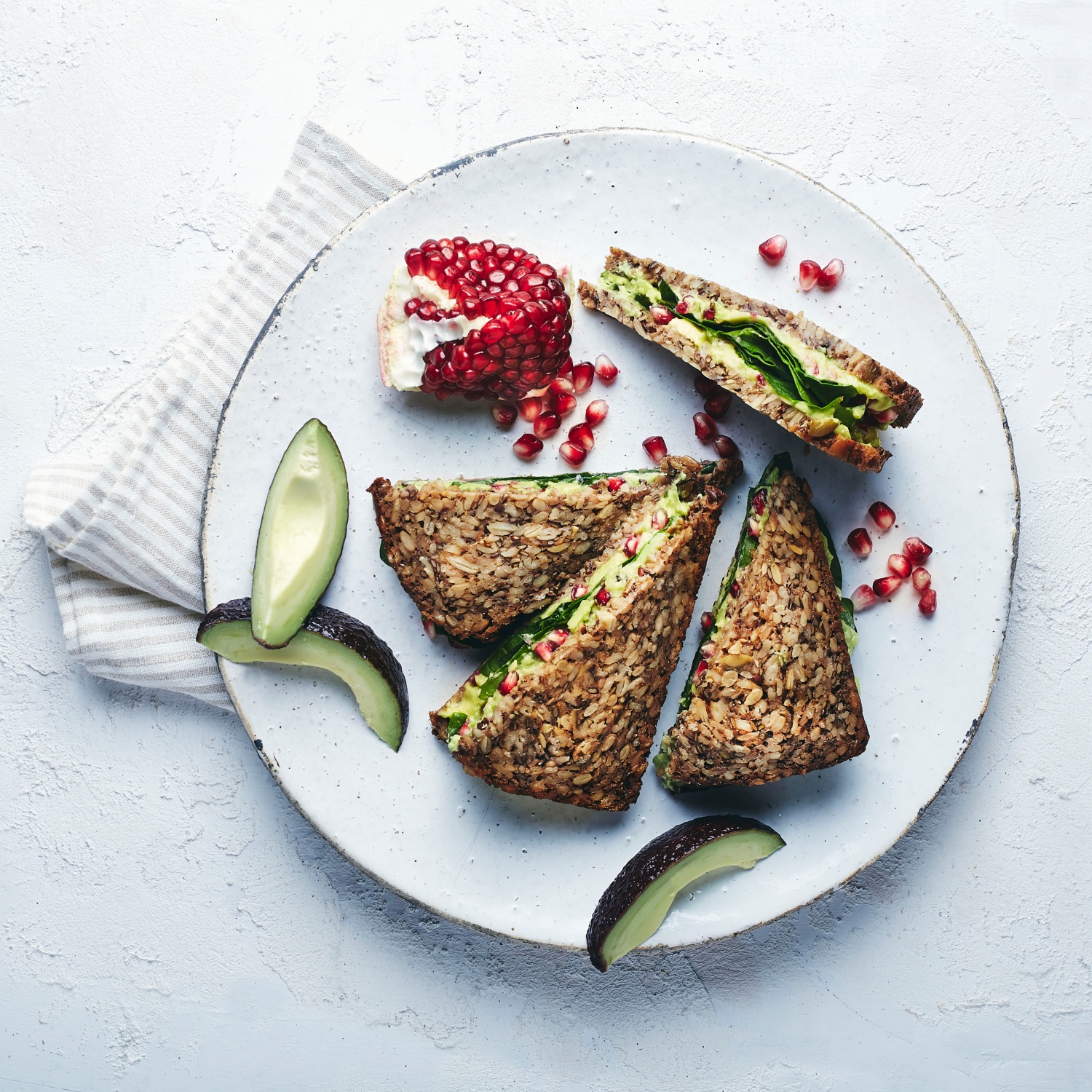 - Die Brotscheiben mit Avocadocreme bestreichen. Auf zwei Scheiben die Granatapfelkerne streuen und die Spinatblätter verteilen. Die beiden übrigen Scheiben auflegen und das Sandwich einmal quer teilen.
