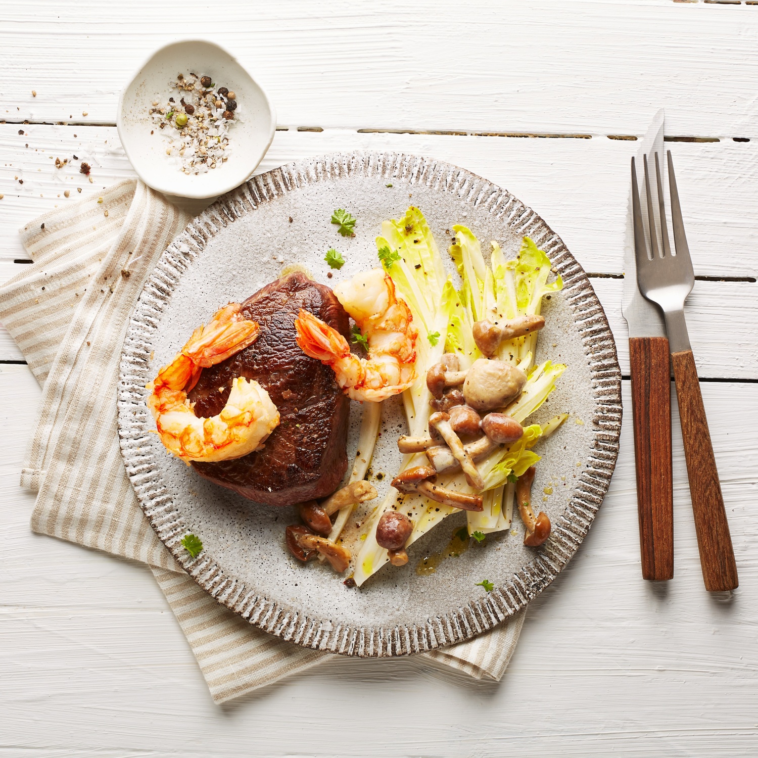 Ganz schön “Gourmet-verdächtig”: Wenn feinstes Rinderfilet und schmackhafte Riesengarnelen auf einen Teller kommen, dann heißt es: Surf ‘n’ Turf! Das nordamerikanische Hauptgericht verführt nicht nur mit einer raffinierten Fleisch-Fischkombination. Auch die flambierten Pilze mit Chicorée machen dieses Rezept zu einem tollen Geschmackserlebnis. Zum Rezept