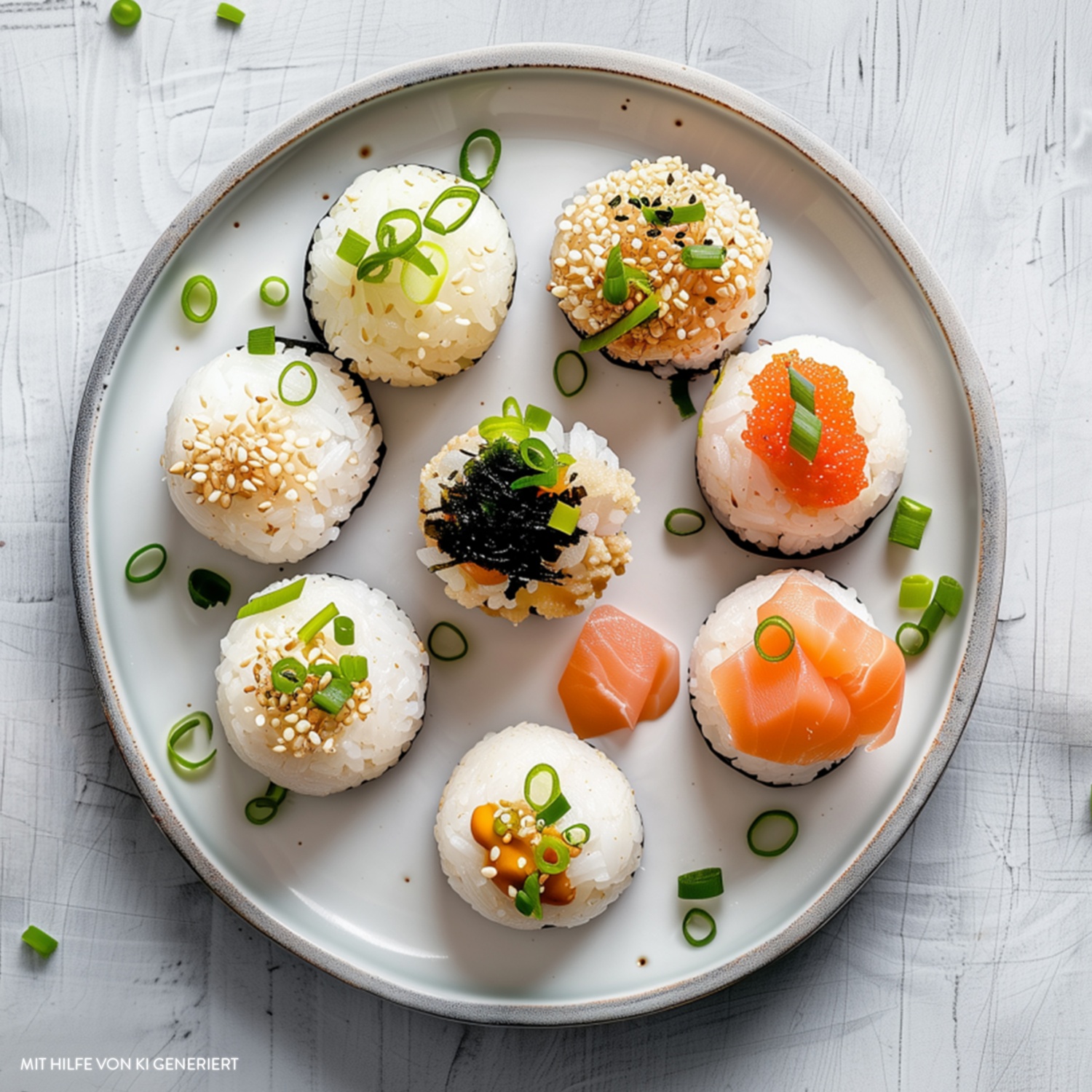 - Die Nori-Reisblätter rund zuschneiden. Die Reisbällchen auf je ein Nori-Blatt platzieren und mit Lachs, Sesam, gehackten Nori-Blättern oder Forellenkaviar belegen. Mit den Frühlingszwiebeln dekorieren.