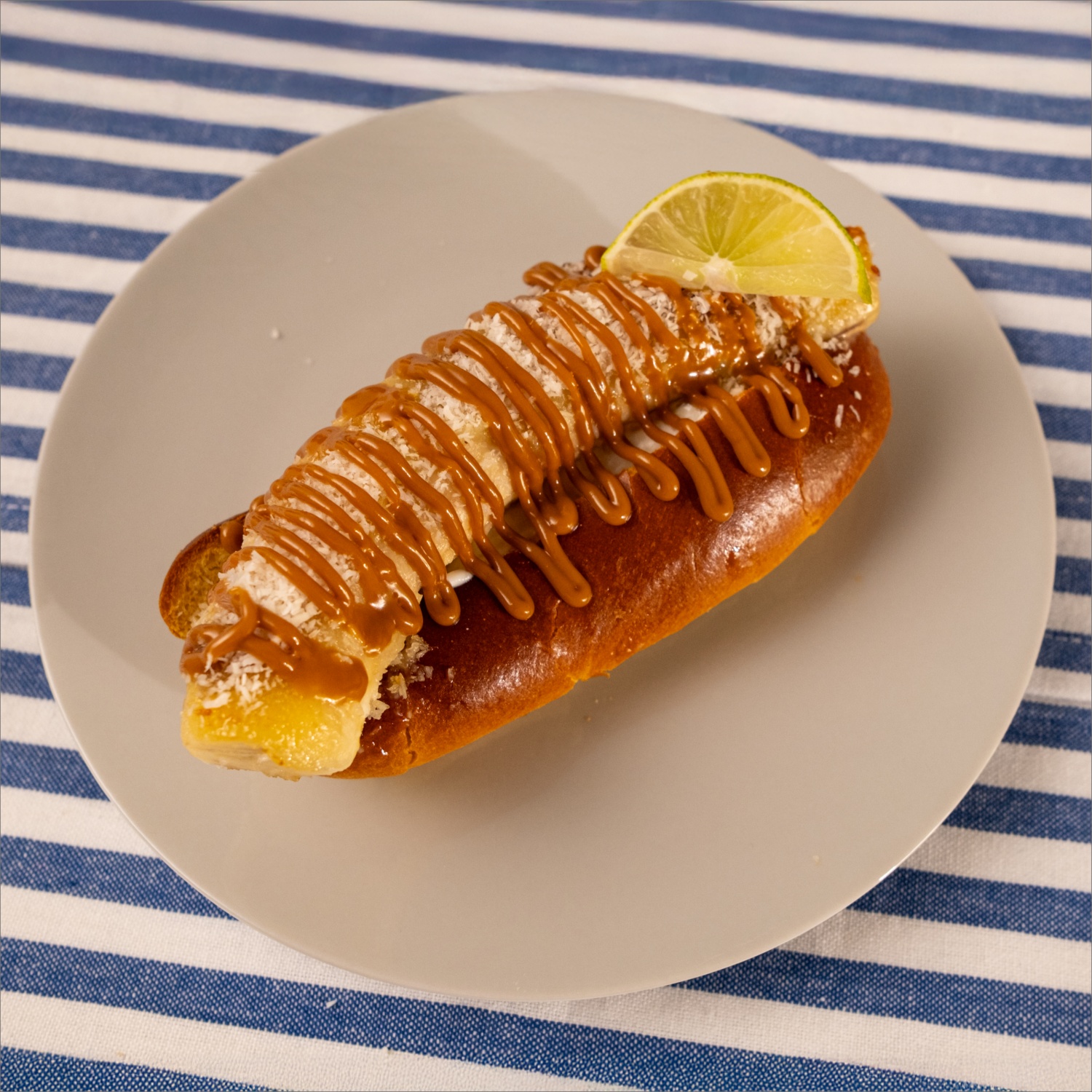 - Die gerösteten Brötchen mit Skyr füllen und die karamellisierte Banane hineinlegen. Mit Biscoff-Creme, weiteren Kokosflocken und einer Scheibe Limette toppen.