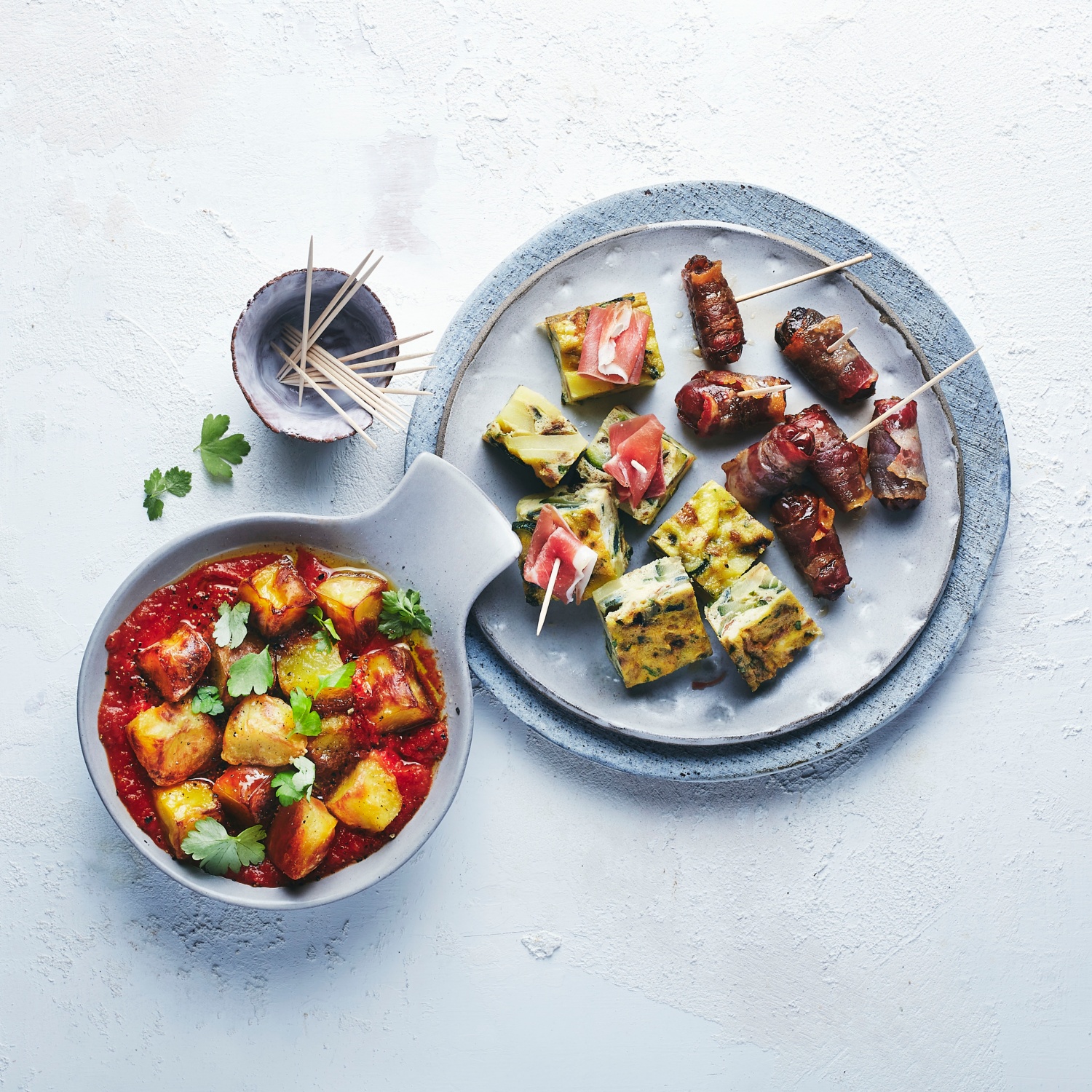 Tapa-Variationen - Kartoffel-Zucchini-Tortilla mit Serrano Schinken, Patatas Bravas mit roter Sauce und Speckdatteln