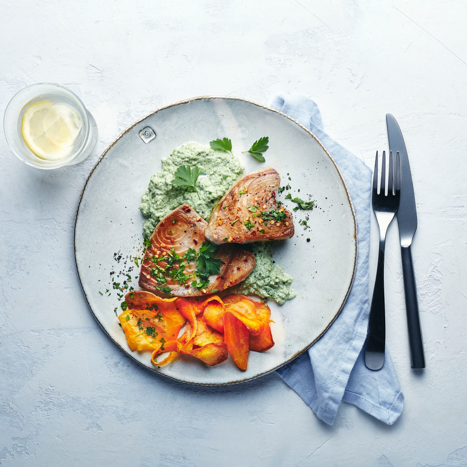 Raffiniert und leicht zubereitet: Mit diesem Thunfisch-Steak auf Brokkoli-Püree mit Gemüsechips punktest du beim Dinner mit Freunden und Verwandten. Zum Rezept