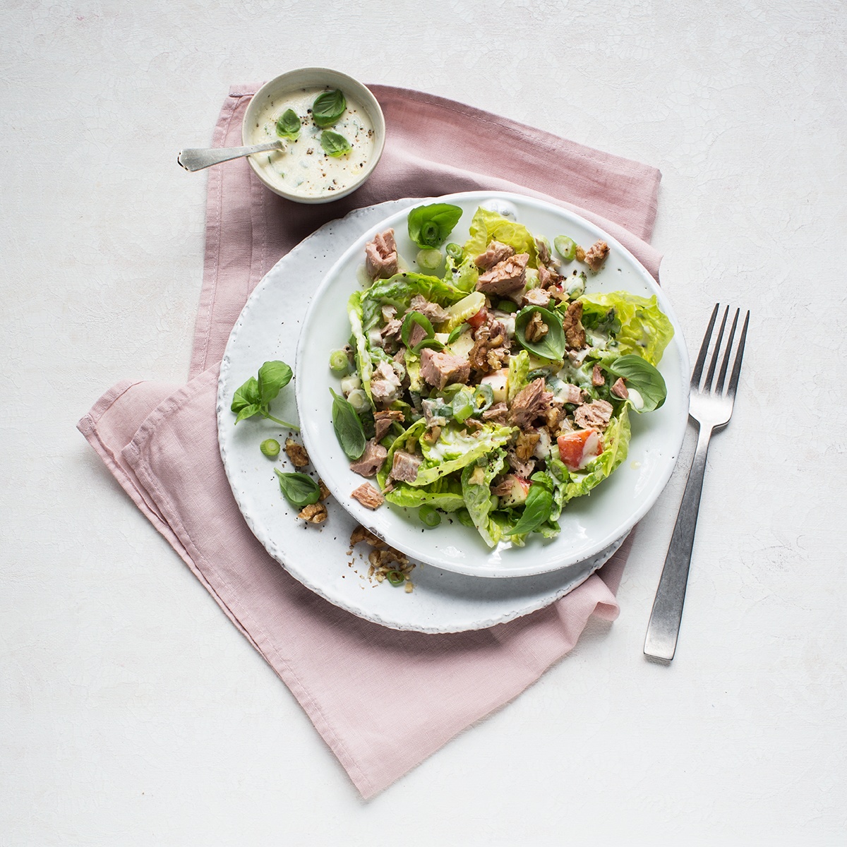 - Den Salat in eine Schüssel geben, den Thunfisch und die Apfelstücke untermengen. Mit dem Dressing und den Frühlingszwiebeln toppen. Den Thunfischsalat mit den gehackten Walnüssen bestreut servieren.