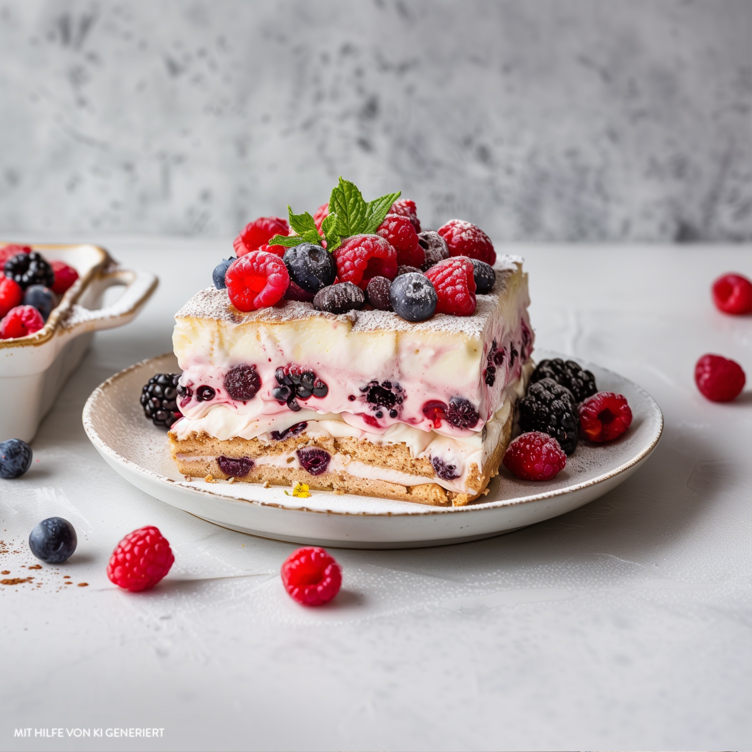 - Vor dem Servieren das Tiramisu mit frischen Himbeeren, Heidelbeeren und Brombeeren belegen. Mit Minze und Puderzucker dekorieren.