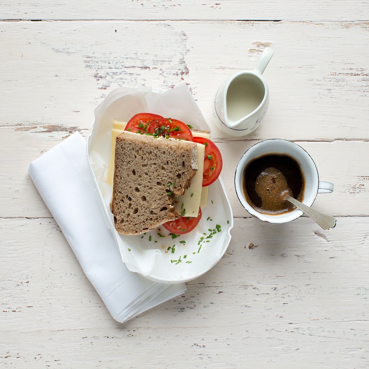 Die Tomate waschen, in Scheiben schneiden und auf den Käse legen. Das Brot halbieren und zuklappen.