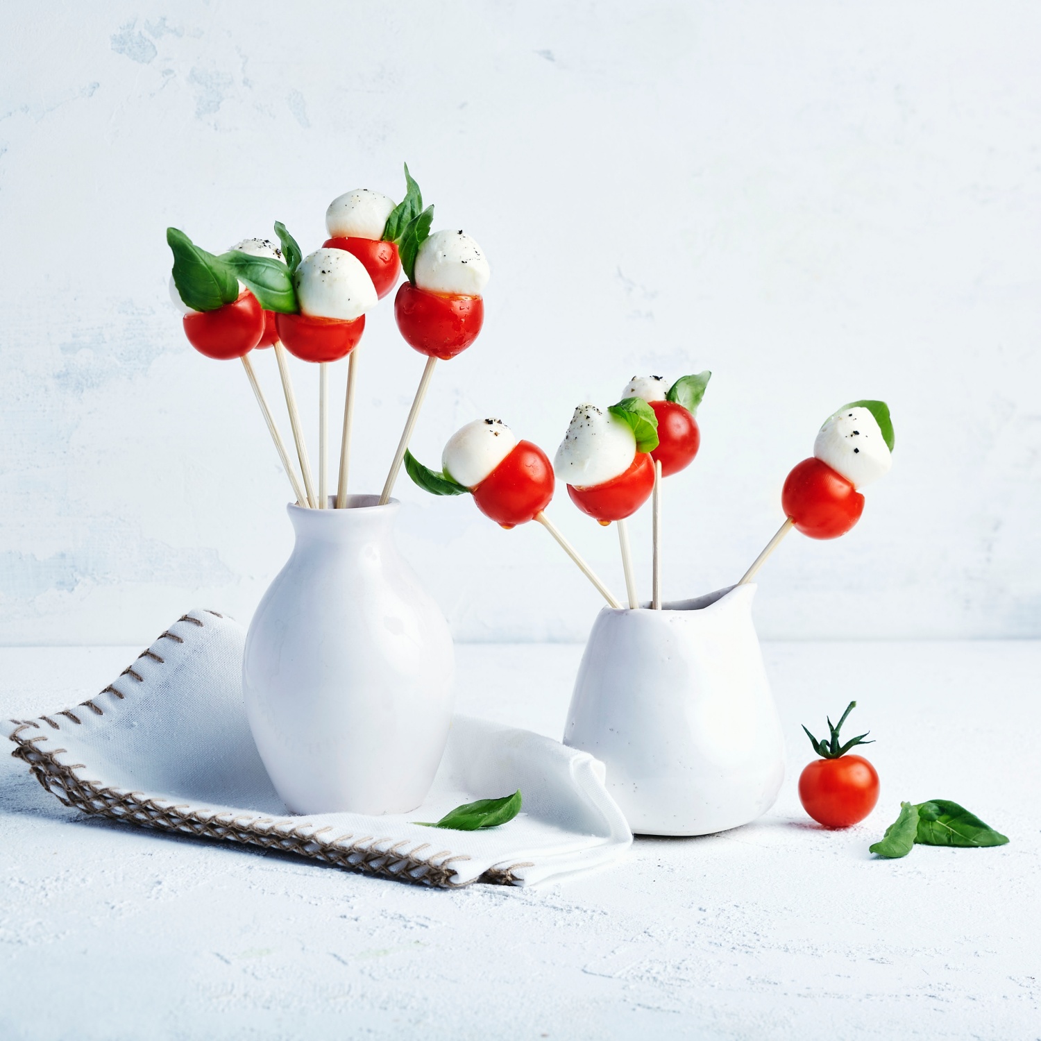 - Die Tomaten-Mozzarella-Sticks wie einen Blumenstrauß in ein Glas oder in eine Vase stellen.