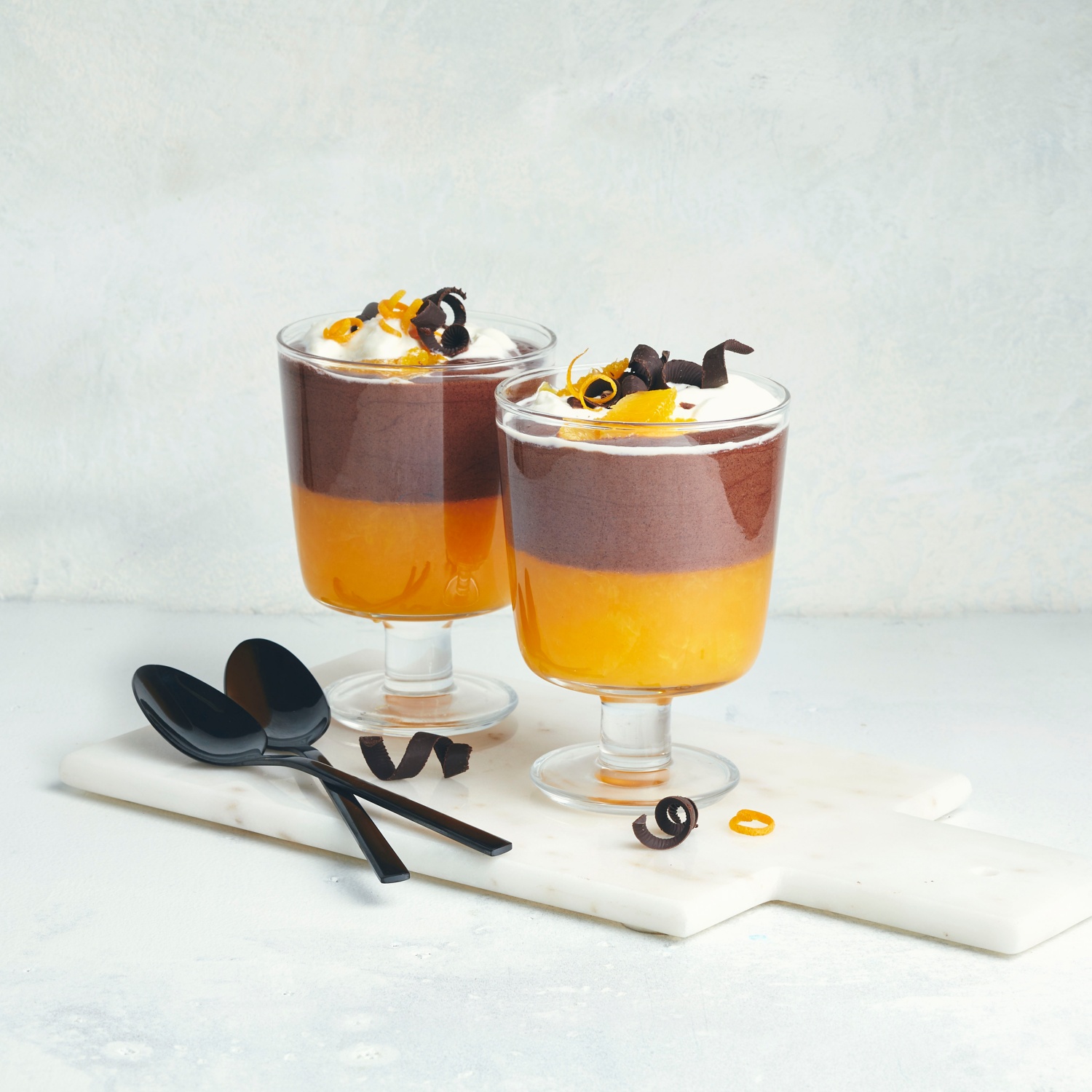 - Zum Anrichten des Desserts die Tonka-Kakao-Creme über die gekühlte Orangen-Creme geben und mit der Kokos-Schlagsahne dekorieren.