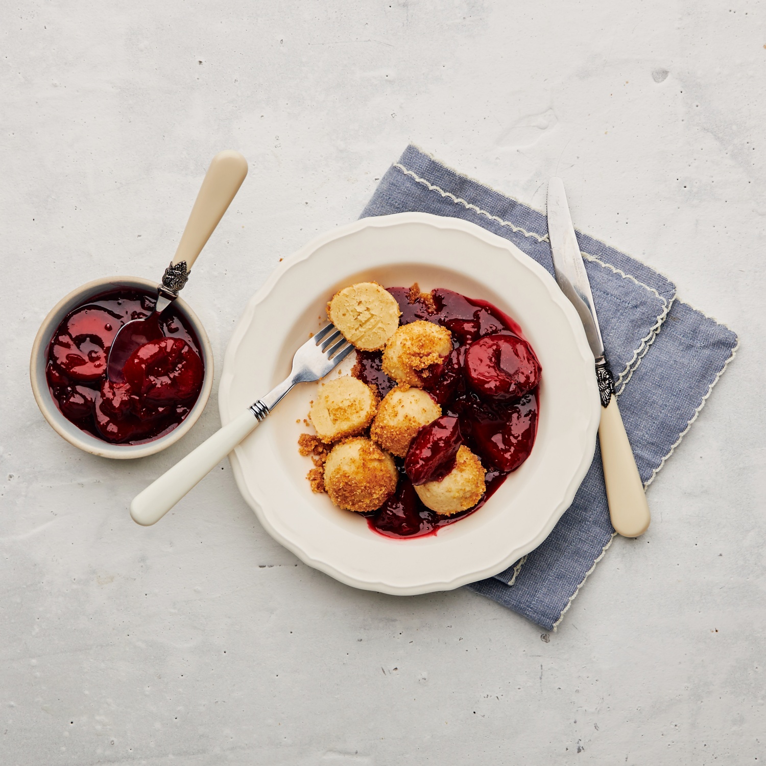 - Die Topfenknödel mit dem Pflaumenkompott servieren.