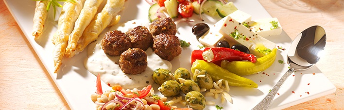 - Fleischbällchen mit Knoblauch-Quark: Hackfleisch, gewürfelte Zwiebel, gehackten Knoblauch, Petersilie und Gewürze mit den Händen gut verkneten und zu kleineren Bällchen formen. Öl in der Pfanne erhitzen und die Fleischbällchen anbraten, bei kleinerer Hitze ca. 10 Minuten garen lassen. Bällchen mit Zaziki-Quark anrichten.