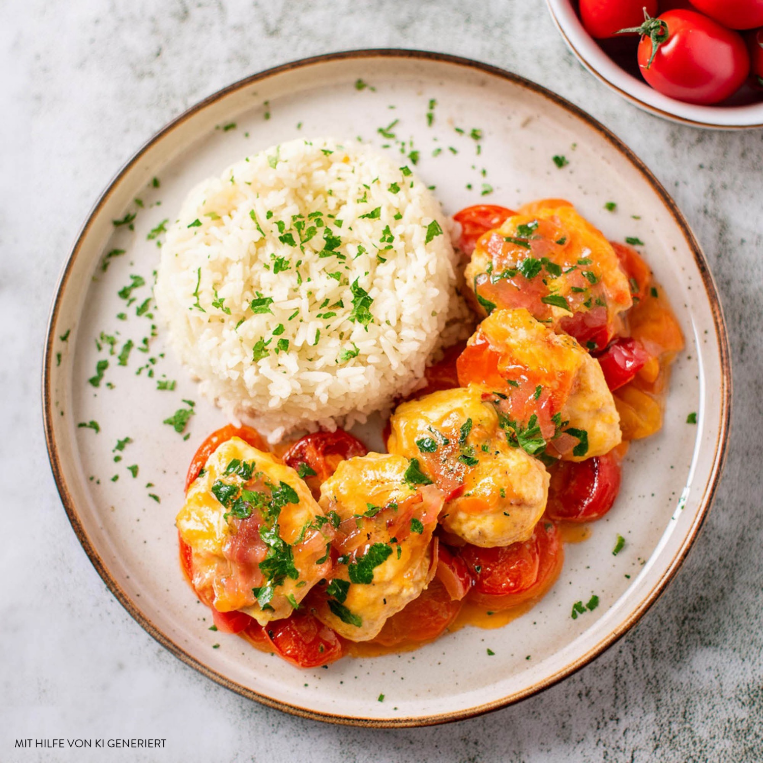 - Tomaten-Paprikasauce mit in die Auflaufform zu den Hähnchenmedaillons geben, mit dem geriebenen Käse bestreuen und im vorgeheizten Ofen 15-20 Minuten überbacken.