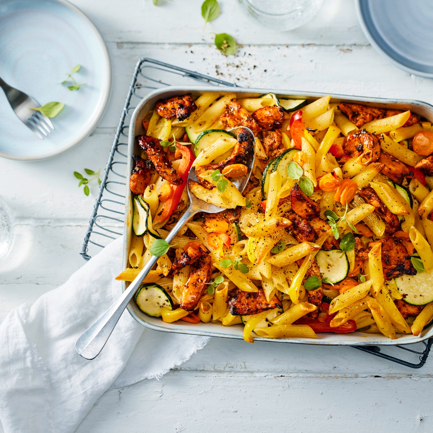 - Den Backofen auf 180 °C Ober-/Unterhitze (160 °C Umluft) vorheizen. Nudeln, Paprika, Zucchini, Karottenscheiben und angebratenes Geschnetzeltes gut vermengen und in eine flache Auflaufform (gefettet) geben.