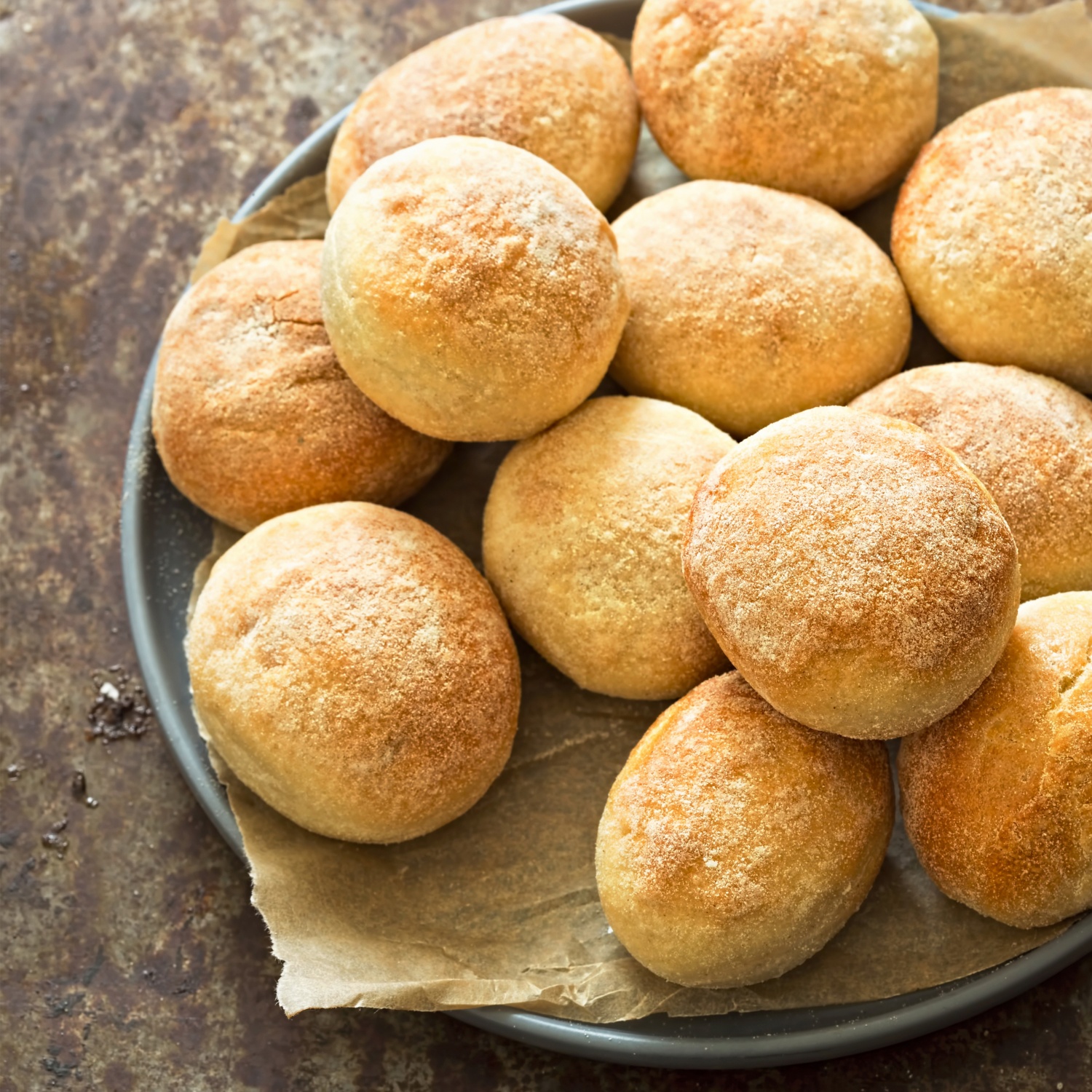 - Den Hefeteig nochmals durchkneten. In 6 Stücke teilen und diese mit geölten Händen zu runden Brötchen (ca. 9-10 cm Durchmesser) formen. Mit 2 EL Sojadrink bestreichen.