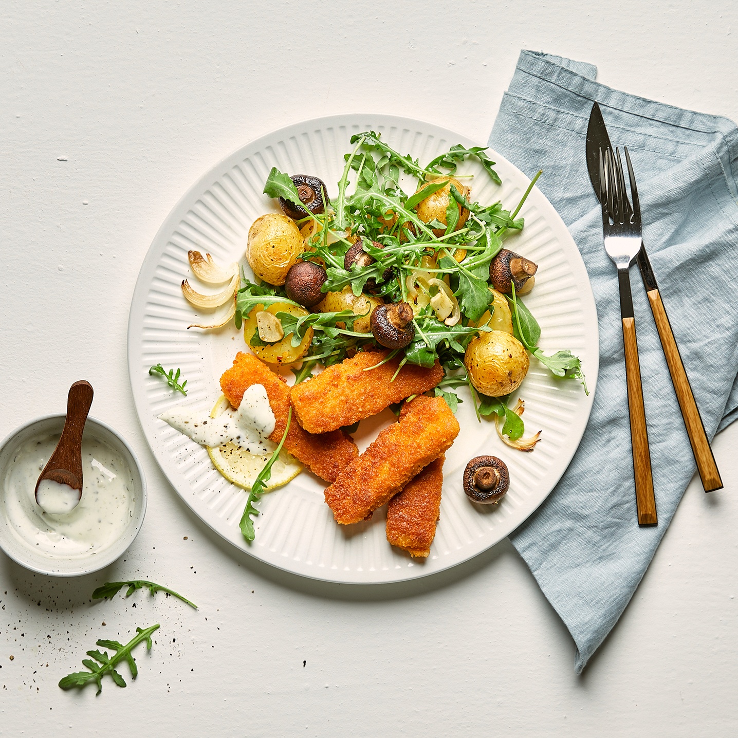5. Die veganen Fischstäbchen in etwas Pflanzenöl knusprig braten und mit dem lauwarmen Kartoffel-Pilz-Salat servieren.