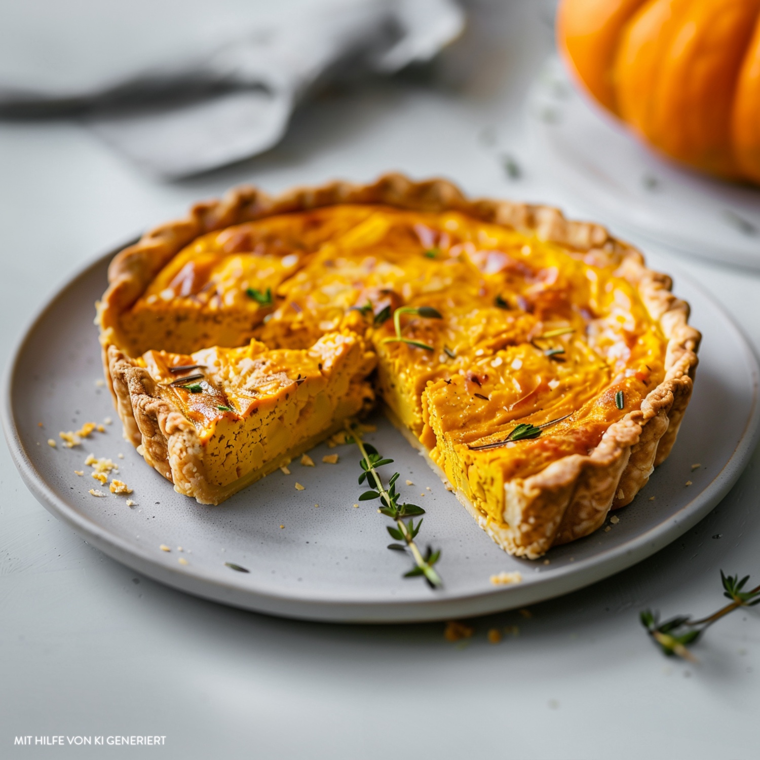 Veganer Ofen-Genuss mit einer knusprig gebackenen Kürbis-Quiche. Kokosmilch gibt der Füllung eine besondere Note. Zum Rezept
