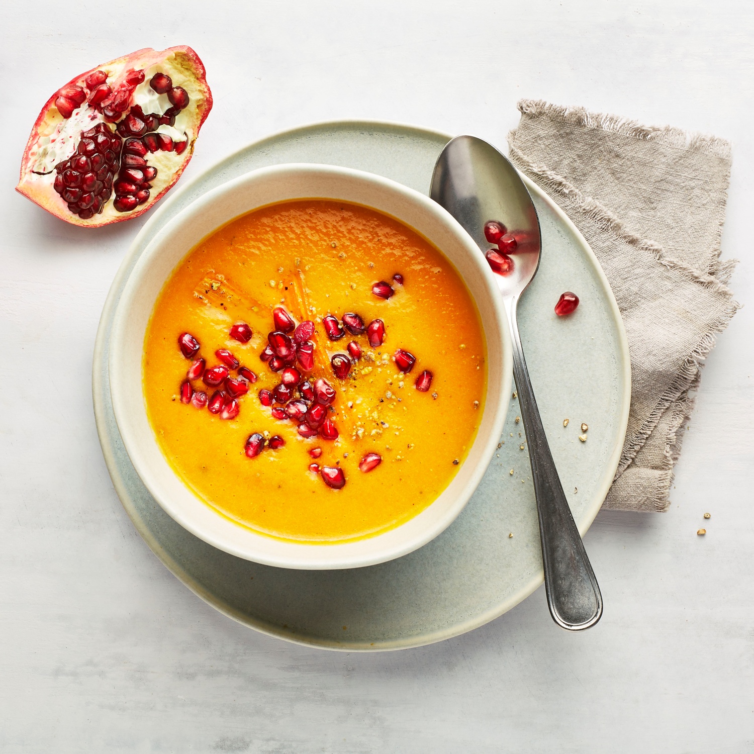 Vegane Paprika-Möhrensuppe mit Granatapfelkernen