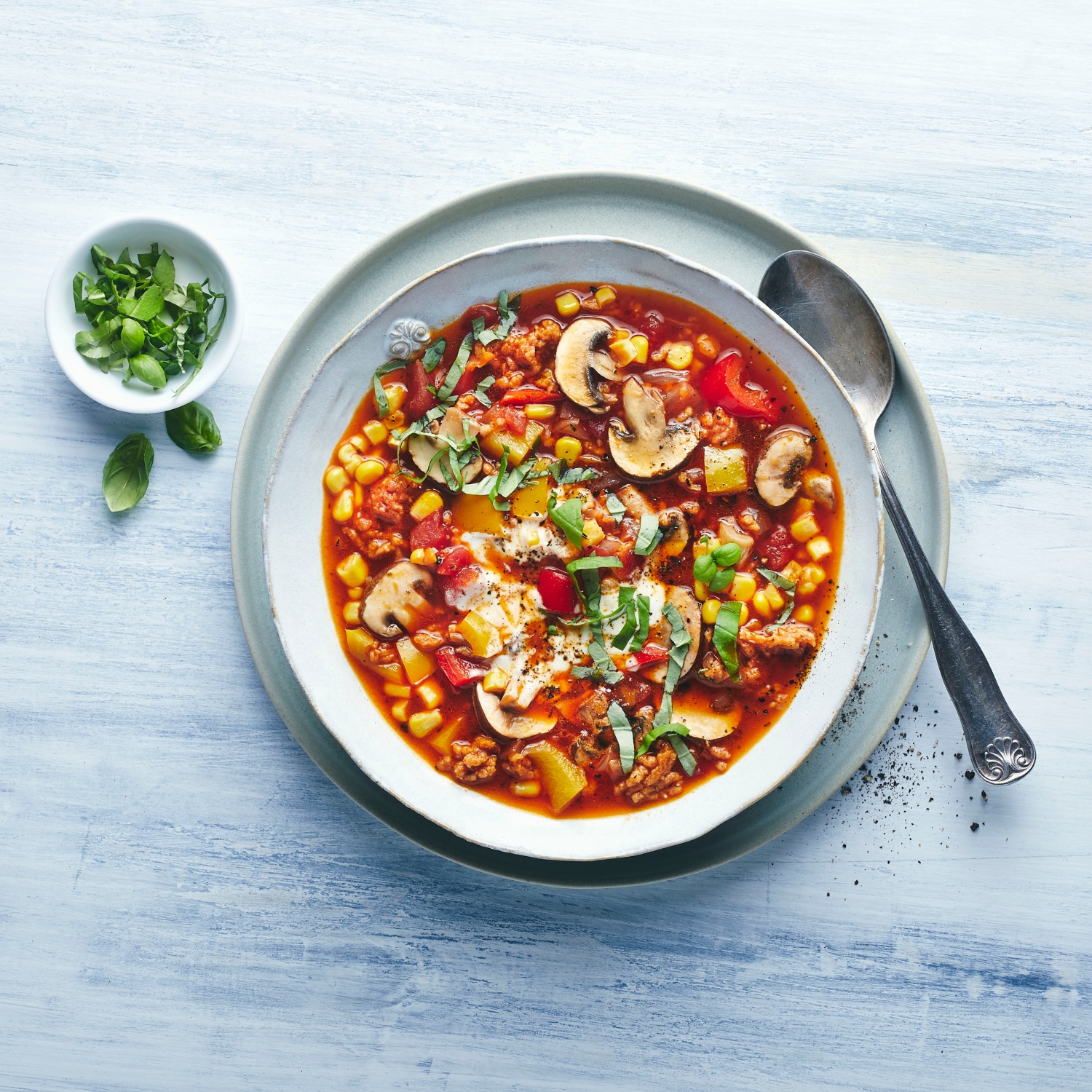 - Die Pizzasuppe mit Sojagurt und Gewürzen verfeinern. Mit gehacktem Basilikum garniert servieren.