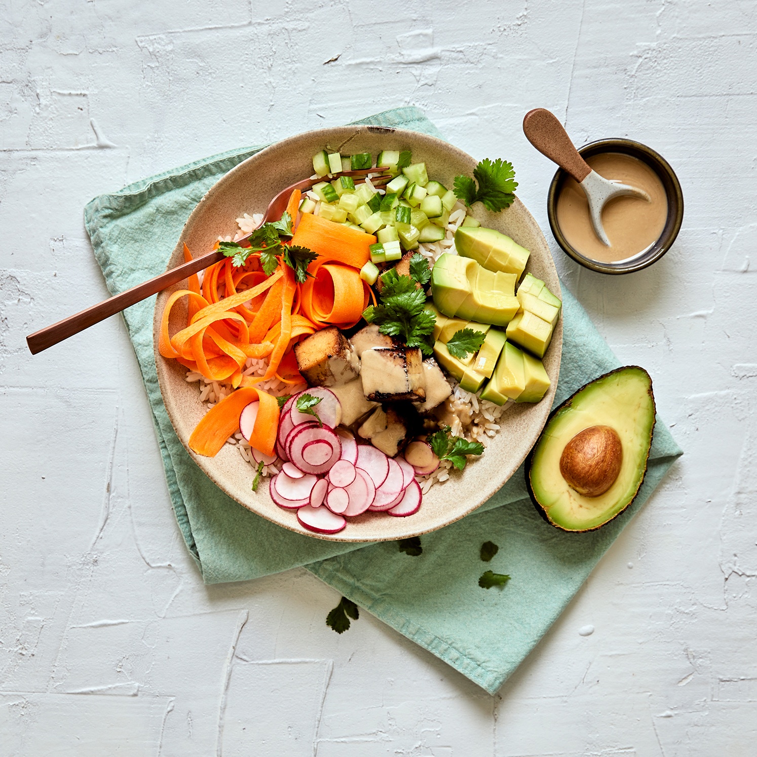 - Den Reis und den Tofu auf 4 Schüsseln portionieren, die Möhren, die Gurken, die Radieschen und die Avocados ebenfalls portionsweise anrichten. Mit Koriander garnieren.