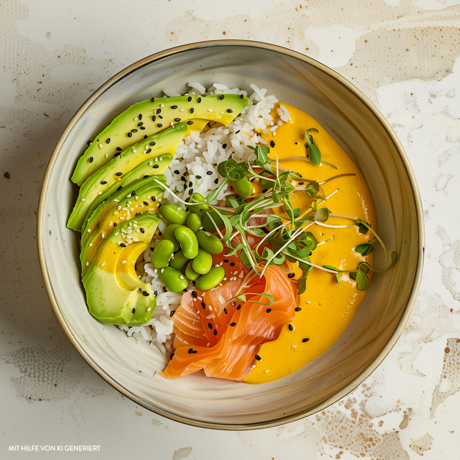 - Den Klebreis in Schalen füllen. Mit den Avocado-Scheiben, veganem Lachs und Edamame anrichten. Die Kurkuma-Sauce dazugeben.